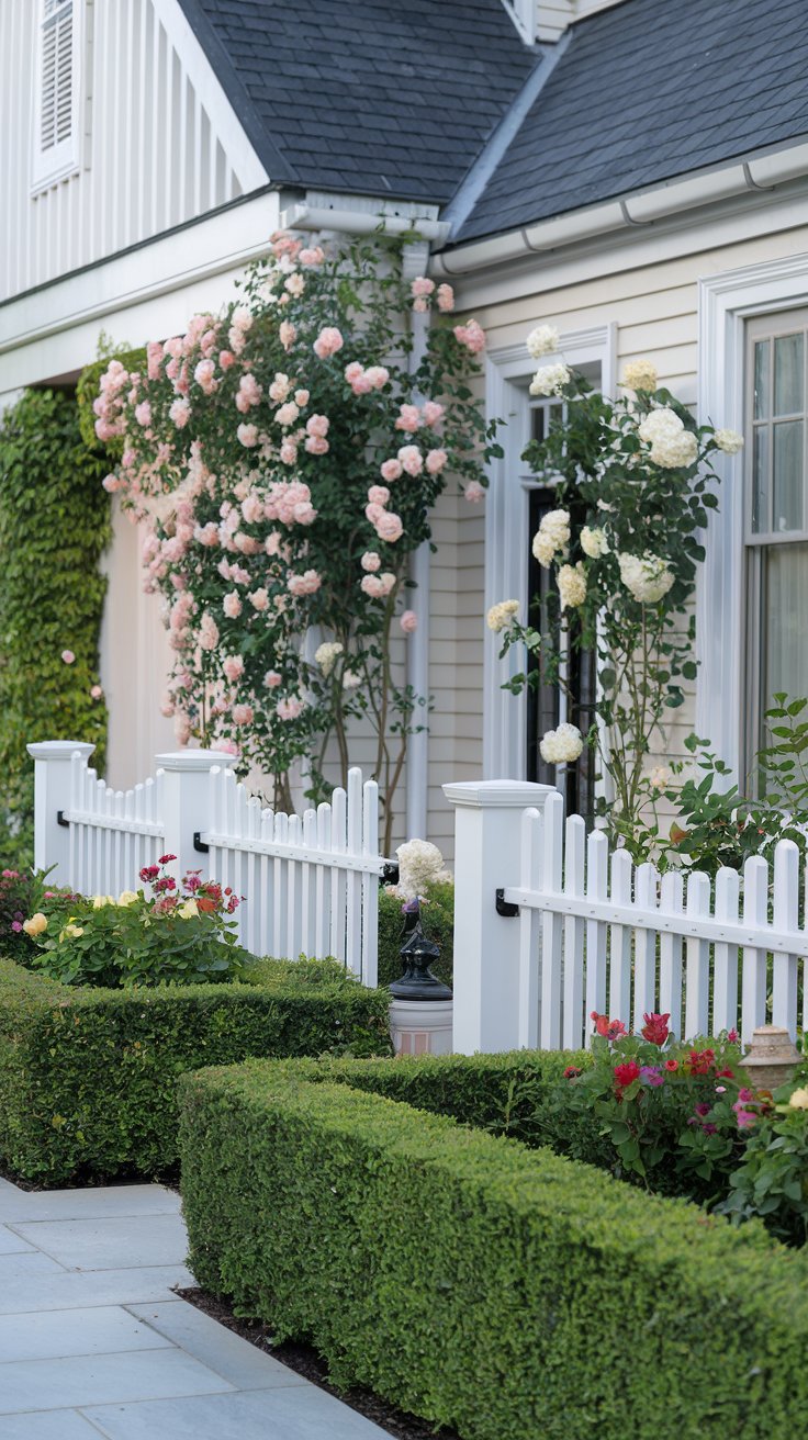 Enhance your curb appeal with a white picket fence adorned with climbing roses. Neatly trimmed hedges along the walkway add charm and structure.