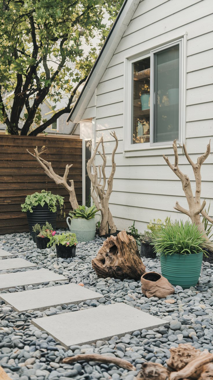 Achieve a natural look with pebbled ground cover, potted plants, and decorative driftwood. This budget-friendly design feels organic and serene.