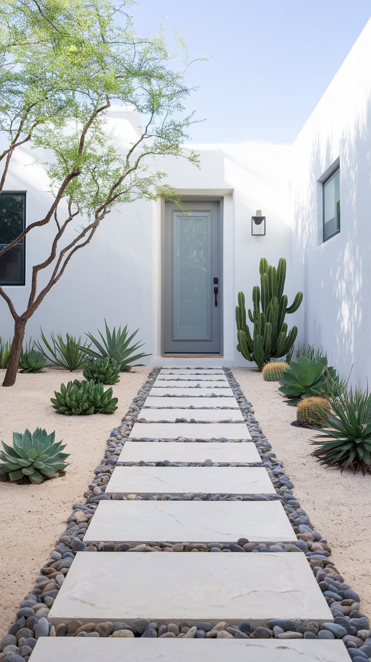 For low-maintenance appeal, line a pebble path with succulents and cacti. This clean and minimal design is perfect for busy homeowners.