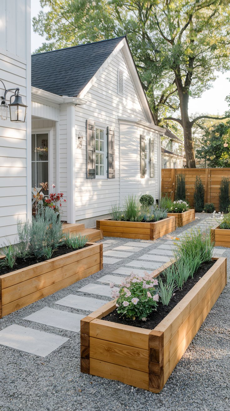 Craft a budget-friendly garden using handmade wooden planters, a gravel path, and small flowering shrubs. This DIY approach is affordable and stylish.