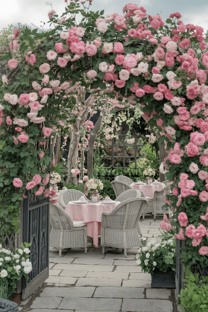 Design a beautiful garden arch covered in pink and white roses, leading into a cozy Easter tea party setting. Decorate the table with pastel tableware, fresh floral arrangements, and wicker chairs for a welcoming touch. Use artificial roses if you want a low-maintenance arch that stays vibrant throughout the season.