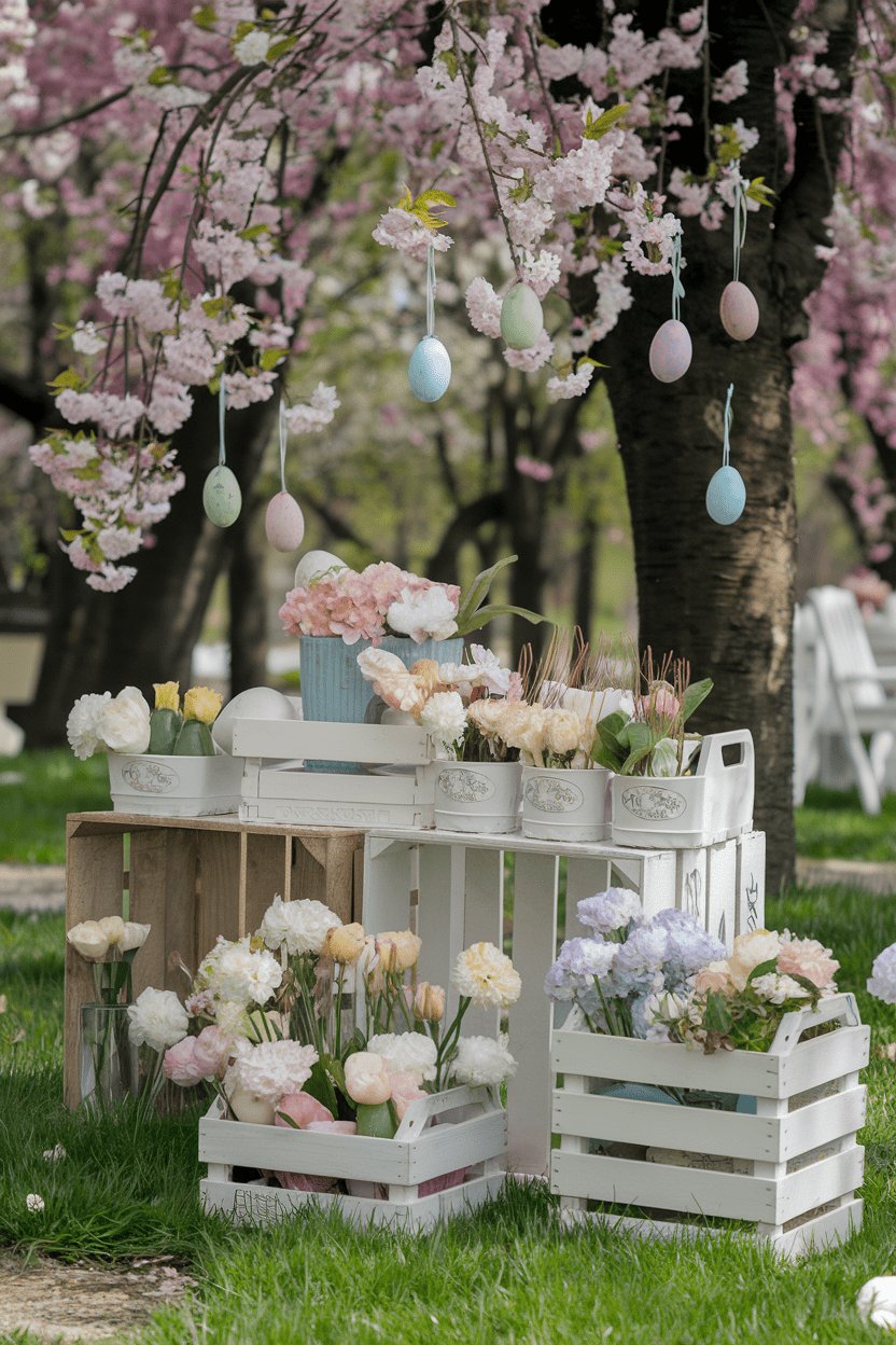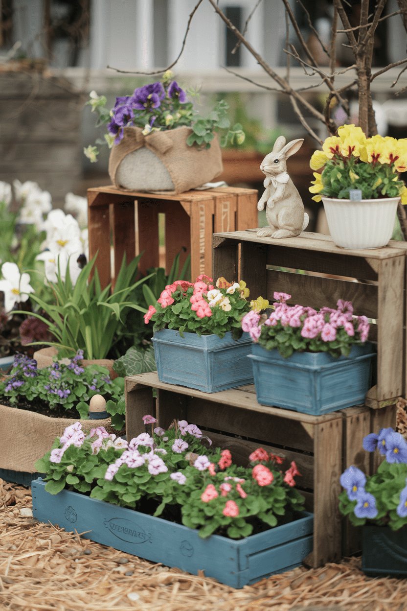 Stack wooden crates filled with potted flowers, wrap planters in burlap, and place a charming rabbit figurine as a centerpiece. Use mismatched vintage elements for a cozy, rustic Easter garden vibe.