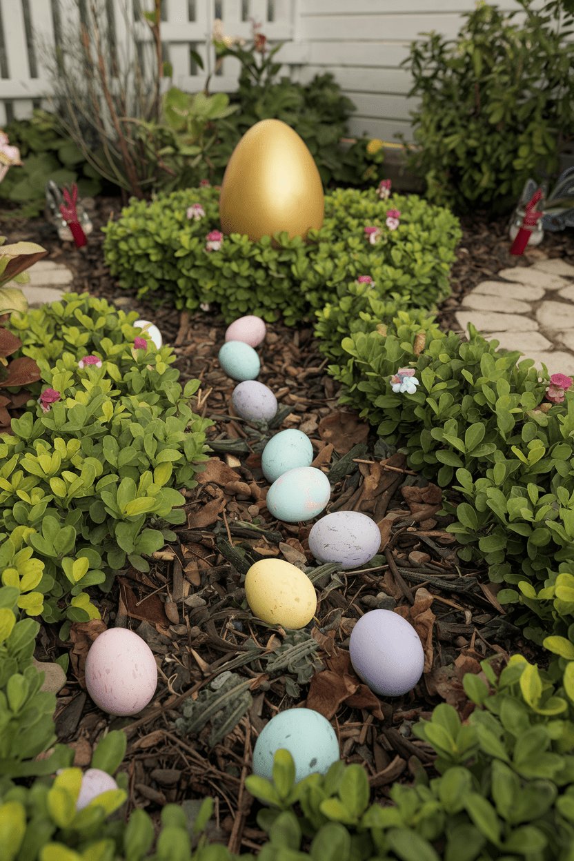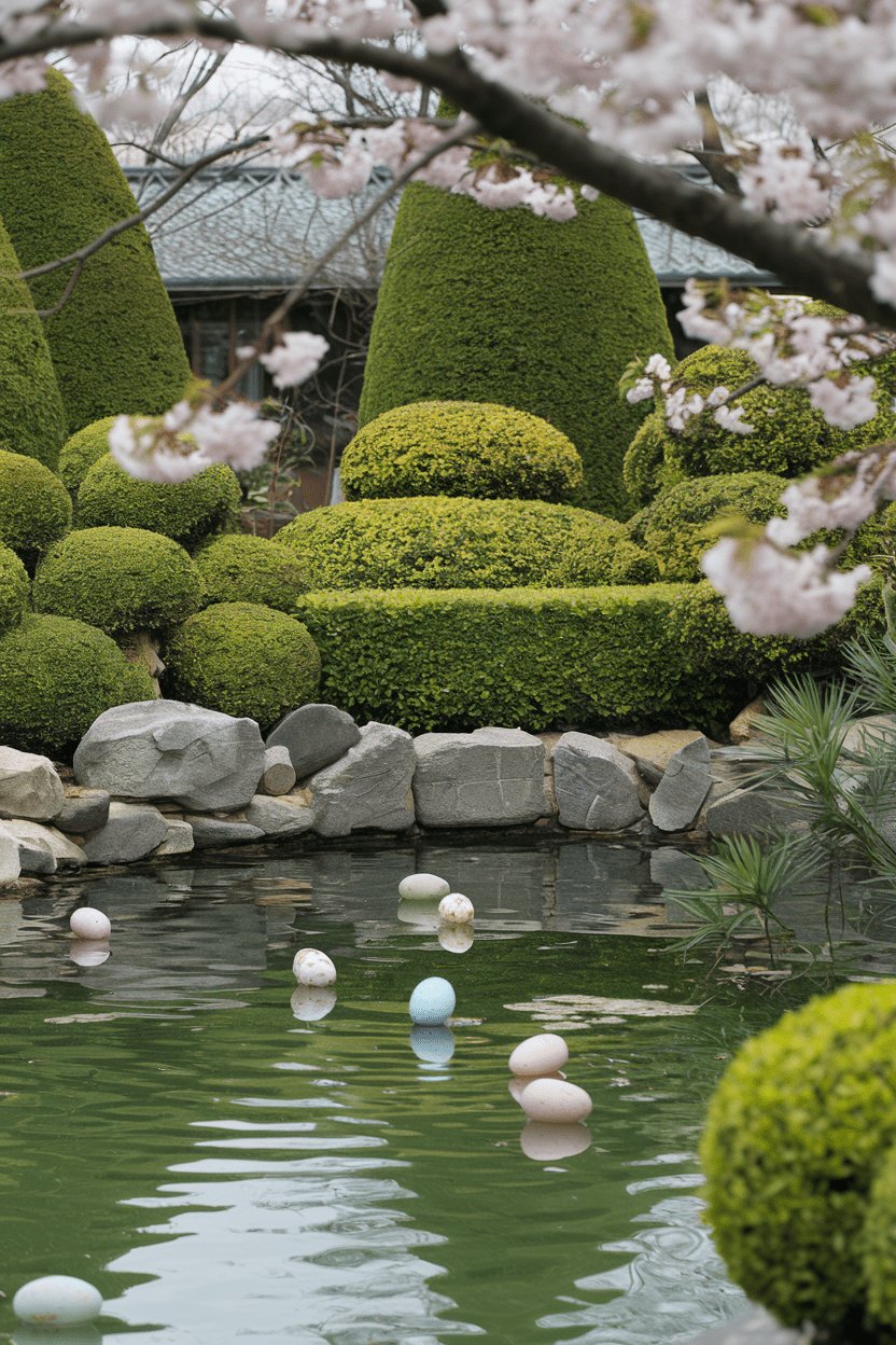 Enhance your garden pond with floating pastel eggs and cherry blossoms for a serene Easter-inspired atmosphere. Use waterproof LED eggs to create a glowing effect at night. Surround the pond with trimmed hedges and soft lantern lighting for a tranquil setting.