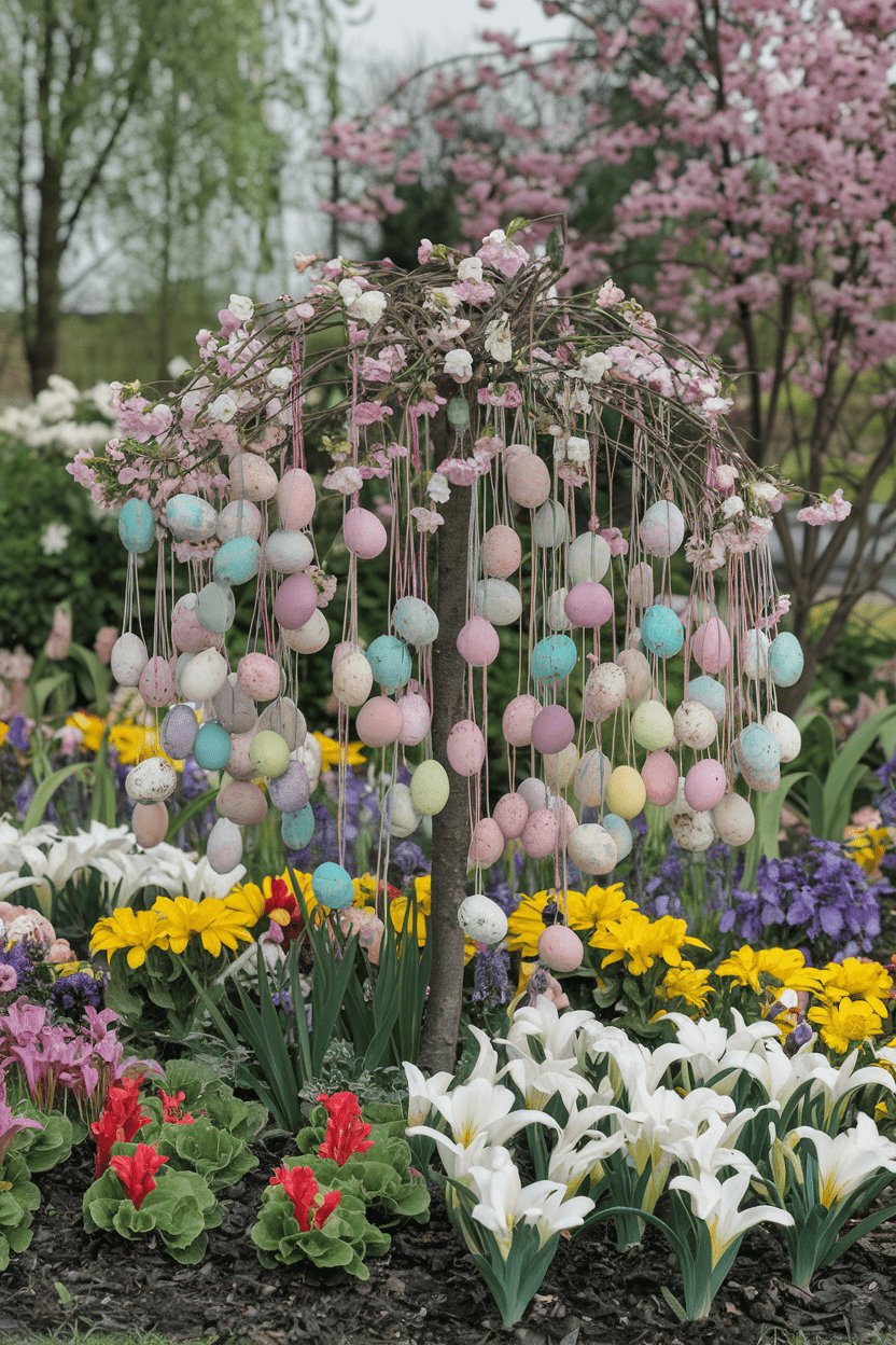 Transform a garden tree into a show-stopping Easter centerpiece by hanging dozens of pastel eggs from its branches. Surround the tree base with vibrant flower beds to enhance the festive look. Secure eggs with waterproof ribbon to keep them swaying beautifully without falling.