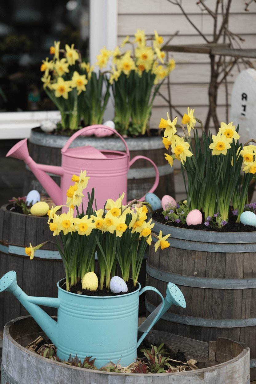 Give old watering cans and wooden barrels new life by repurposing them into vibrant Easter planters. Fill them with bright yellow daffodils and tuck pastel eggs among the flowers for an eye-catching display. Arrange different-sized barrels together to create depth, and add small bunny figurines around them for a playful touch.