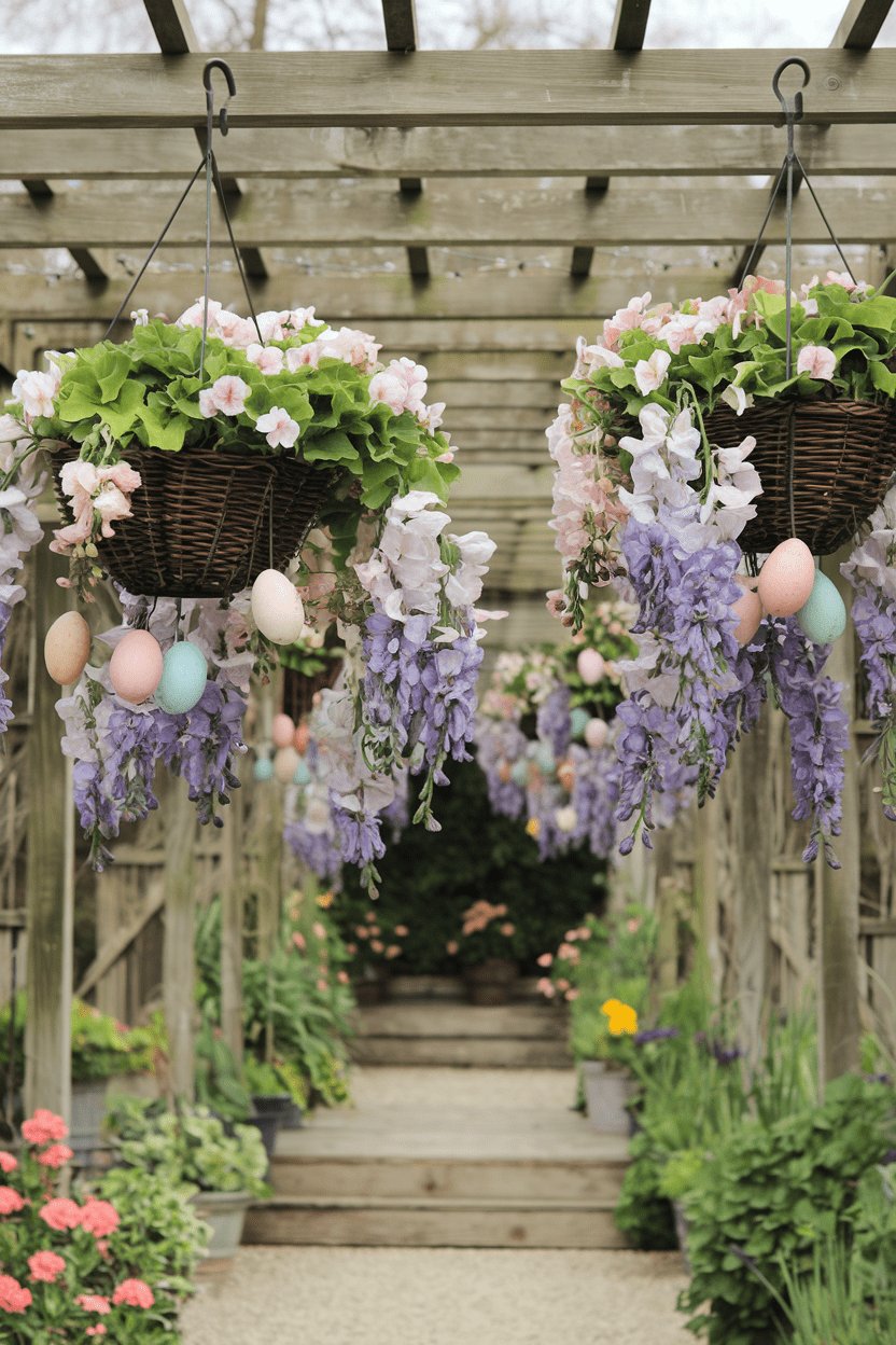 Suspend hanging baskets filled with cascading flowers and pastel eggs from a wooden pergola to create a dreamy Easter garden setting. Choose flowers like petunias or lobelias for their flowing effect. For extra whimsy, add small LED string lights among the baskets to create a magical glow in the evening.