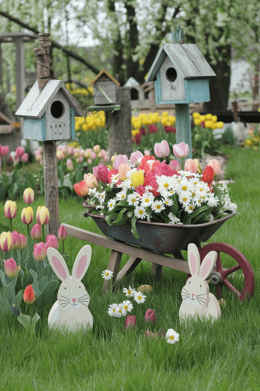 Repurpose a vintage wheelbarrow as a stunning Easter garden feature by filling it with tulips, daisies, and handcrafted wooden bunnies. Add a rustic birdhouse to complete the look, and drape a pastel ribbon around the handles for extra charm. If you want a longer-lasting display, use artificial flowers mixed with real greenery for a natural effect.