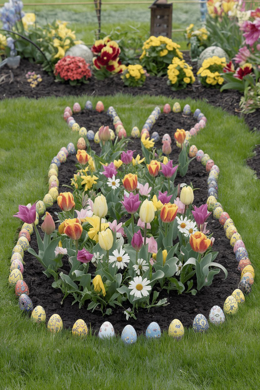 Shape a garden bed like a bunny and fill it with colorful tulips and daisies. Border it with tiny Easter egg markers for extra charm. Use a variety of flower colors to create contrast and make the bunny shape more defined.