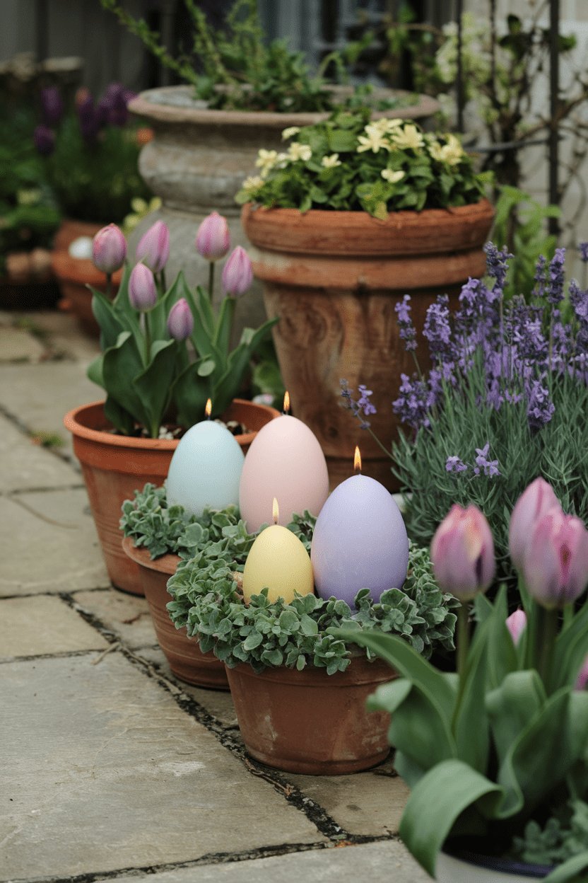Decorate a cozy garden patio with handmade pastel egg-shaped candles flickering among potted tulips and lavender. Use scented candles in fresh floral aromas to enhance the ambiance. Arrange the candles at varying heights to create a dynamic display.