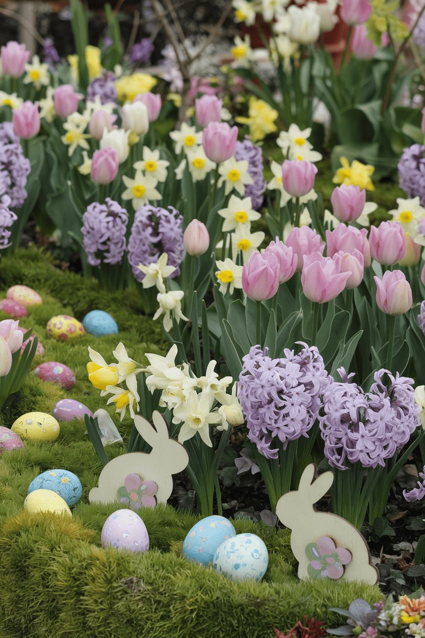 Transform your garden into a pastel paradise with tulips, daffodils, and hyacinths in soft hues. Place wooden bunny cutouts among the flower beds and nestle painted Easter eggs in mossy corners for a whimsical touch. For added charm, use weather-resistant paint on the cutouts and arrange the eggs in groups for a natural look.