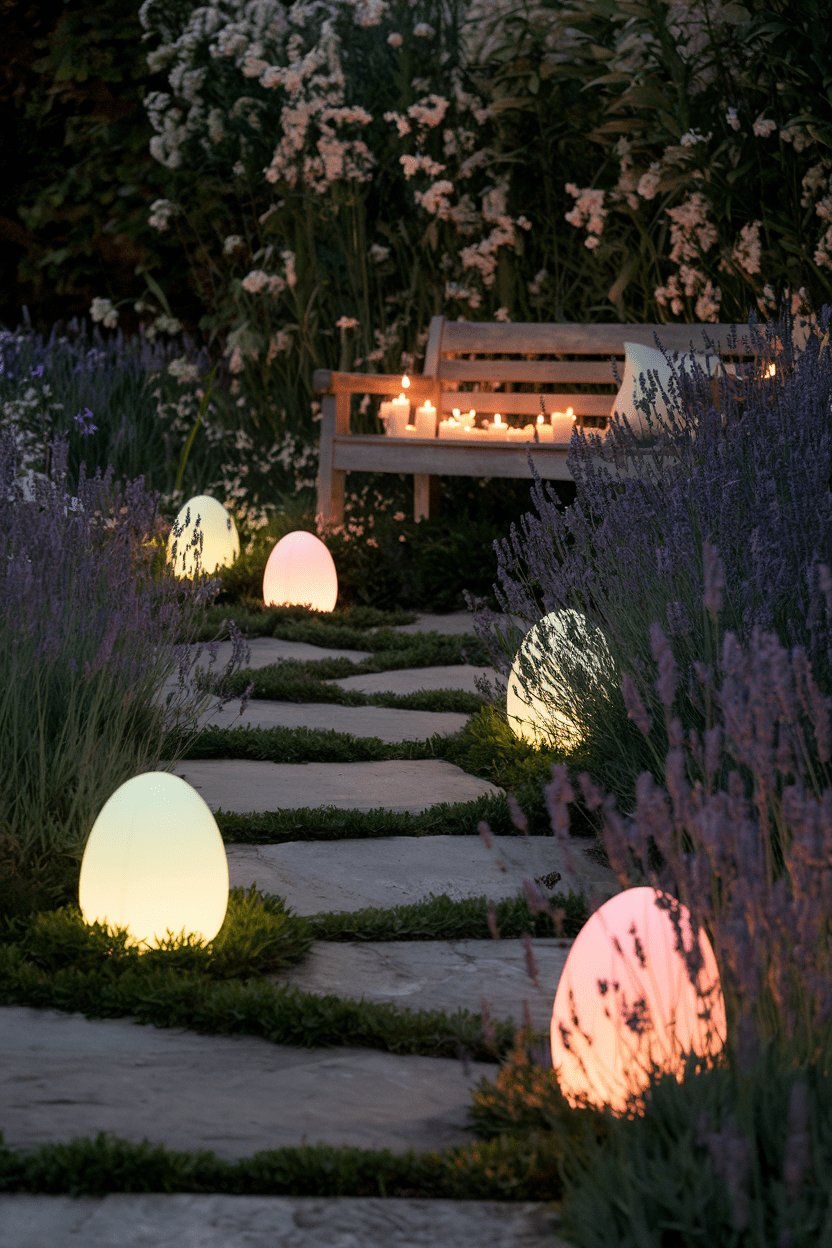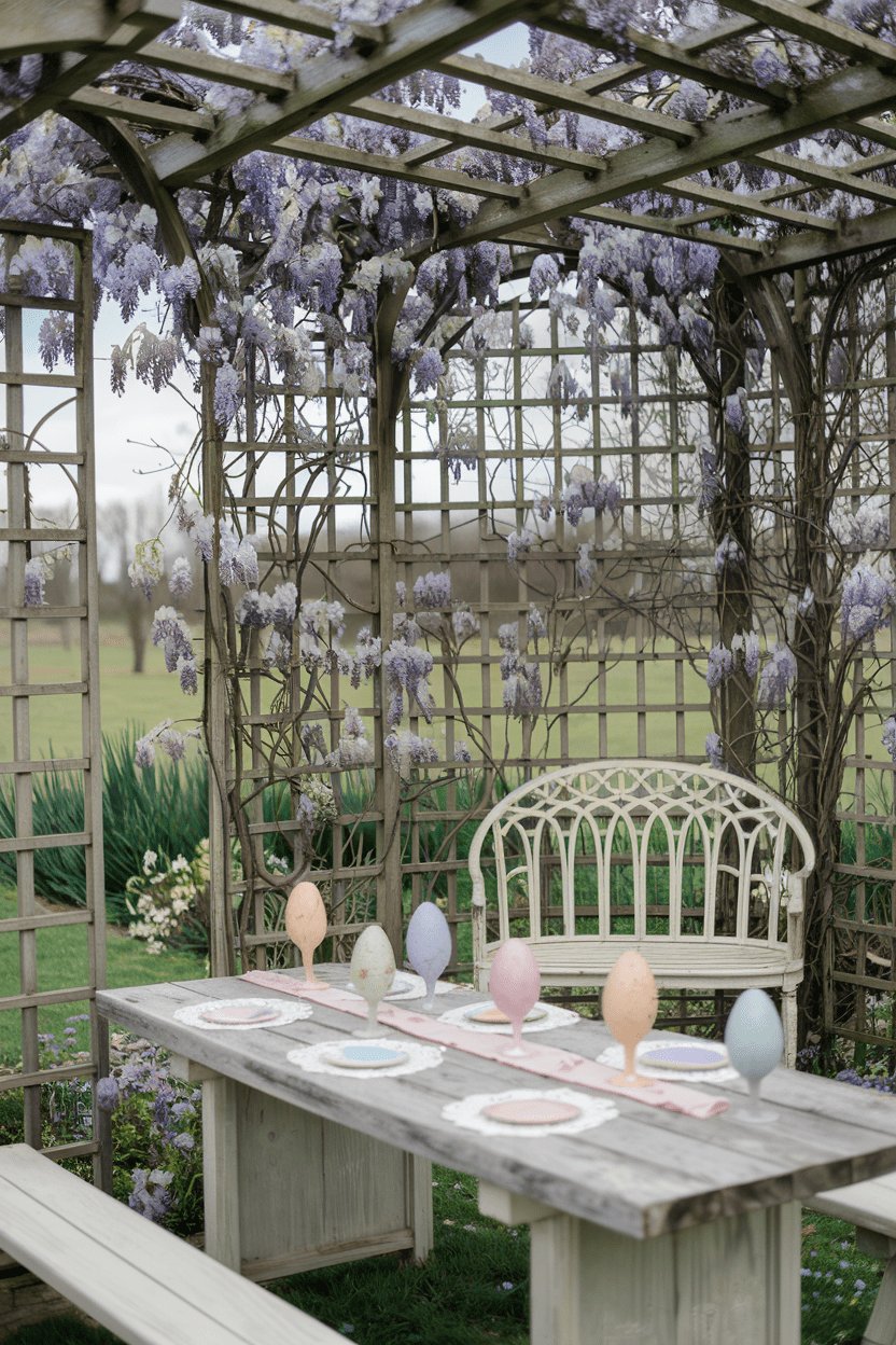 Drape trellises in cascading wisteria and place an elegant white bench underneath for a peaceful Easter retreat. Add pastel egg centerpieces on a rustic wooden table for a refined look. Use solar-powered lanterns to softly illuminate the space at night.