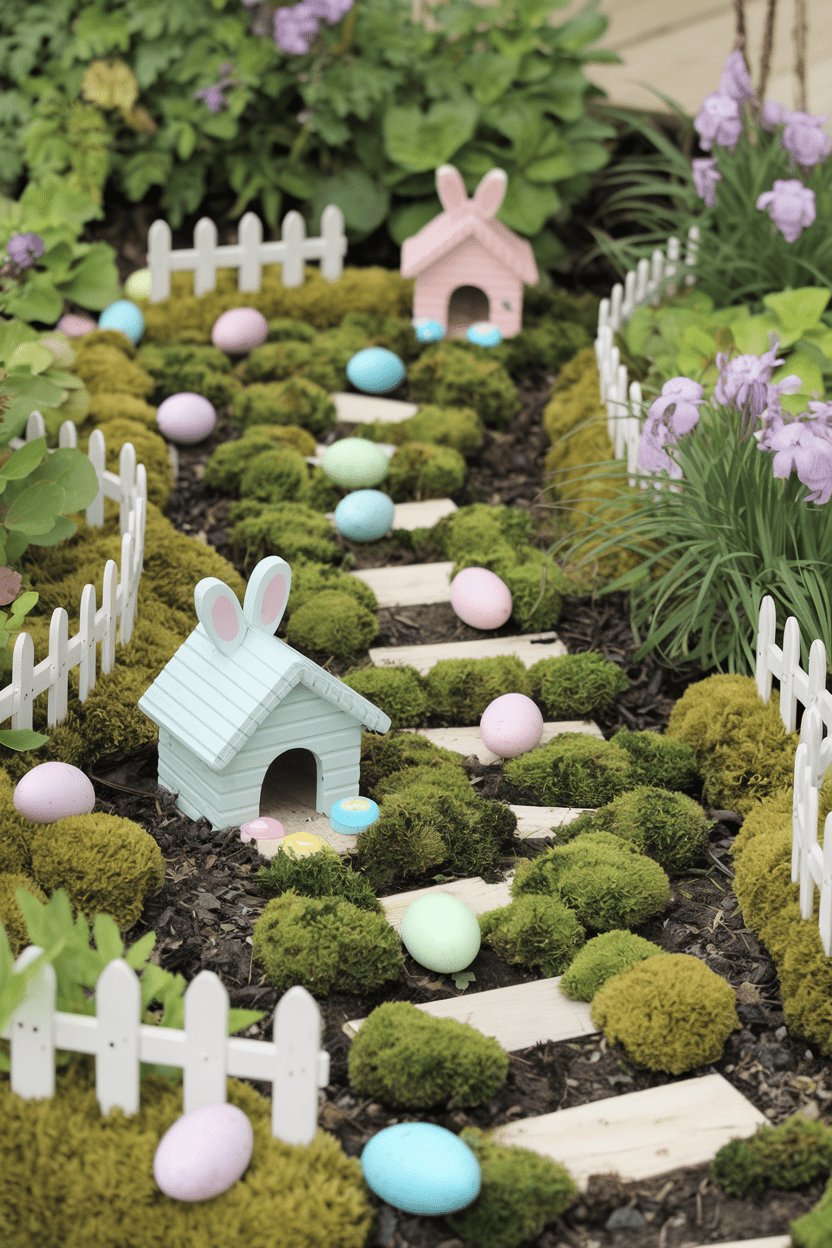 Create a delightful Easter scene with tiny wooden bunny houses, miniature picket fences, and pastel eggs scattered along moss-covered walkways. Arrange small potted flowers around each house and use natural stones for a charming pathway. This idea works especially well for small garden spaces or container gardens.