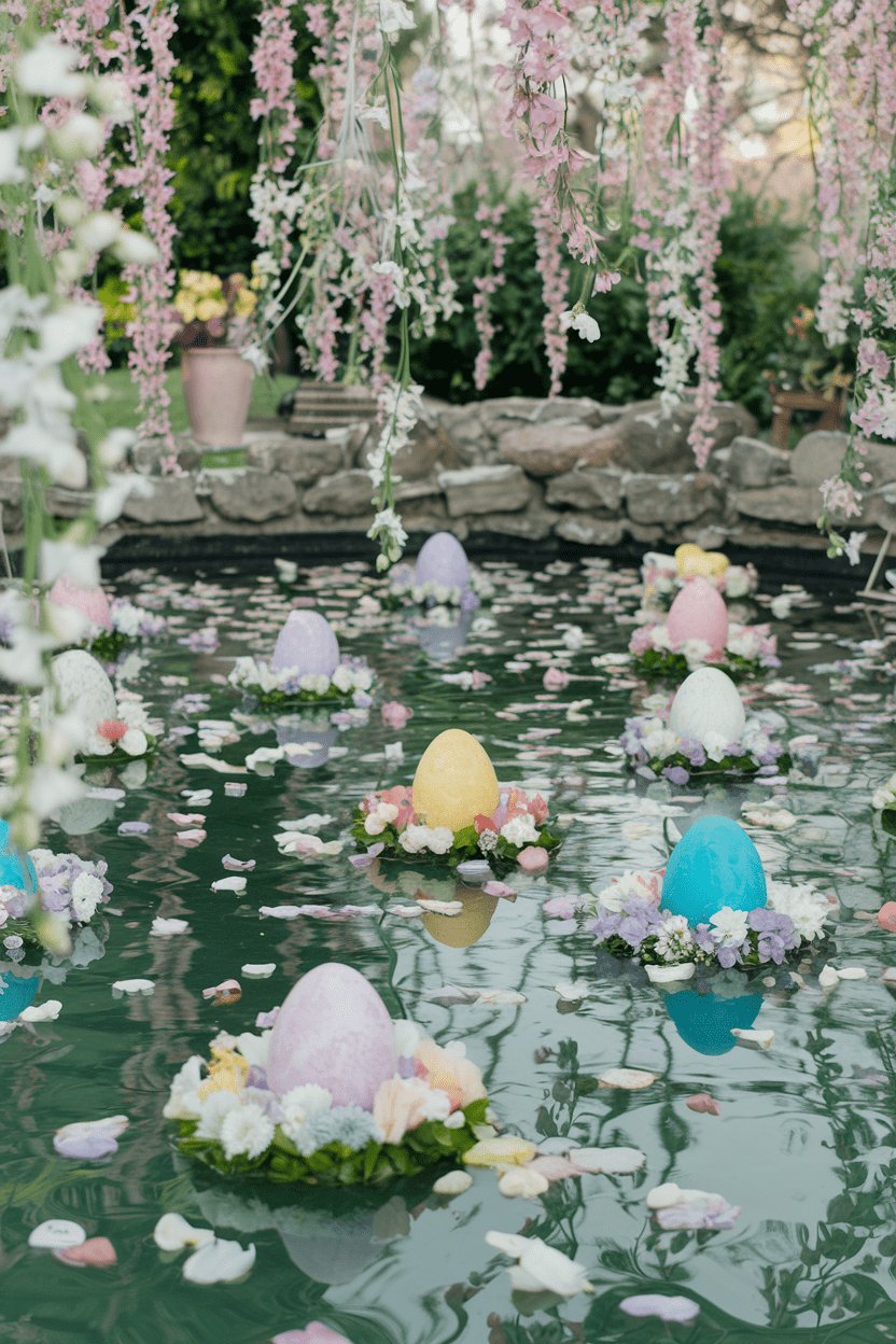 Decorate an outdoor pond with floating Easter egg arrangements made of delicate flowers and petals. Use biodegradable materials to keep it eco-friendly. This elegant feature will create a magical springtime ambiance.
