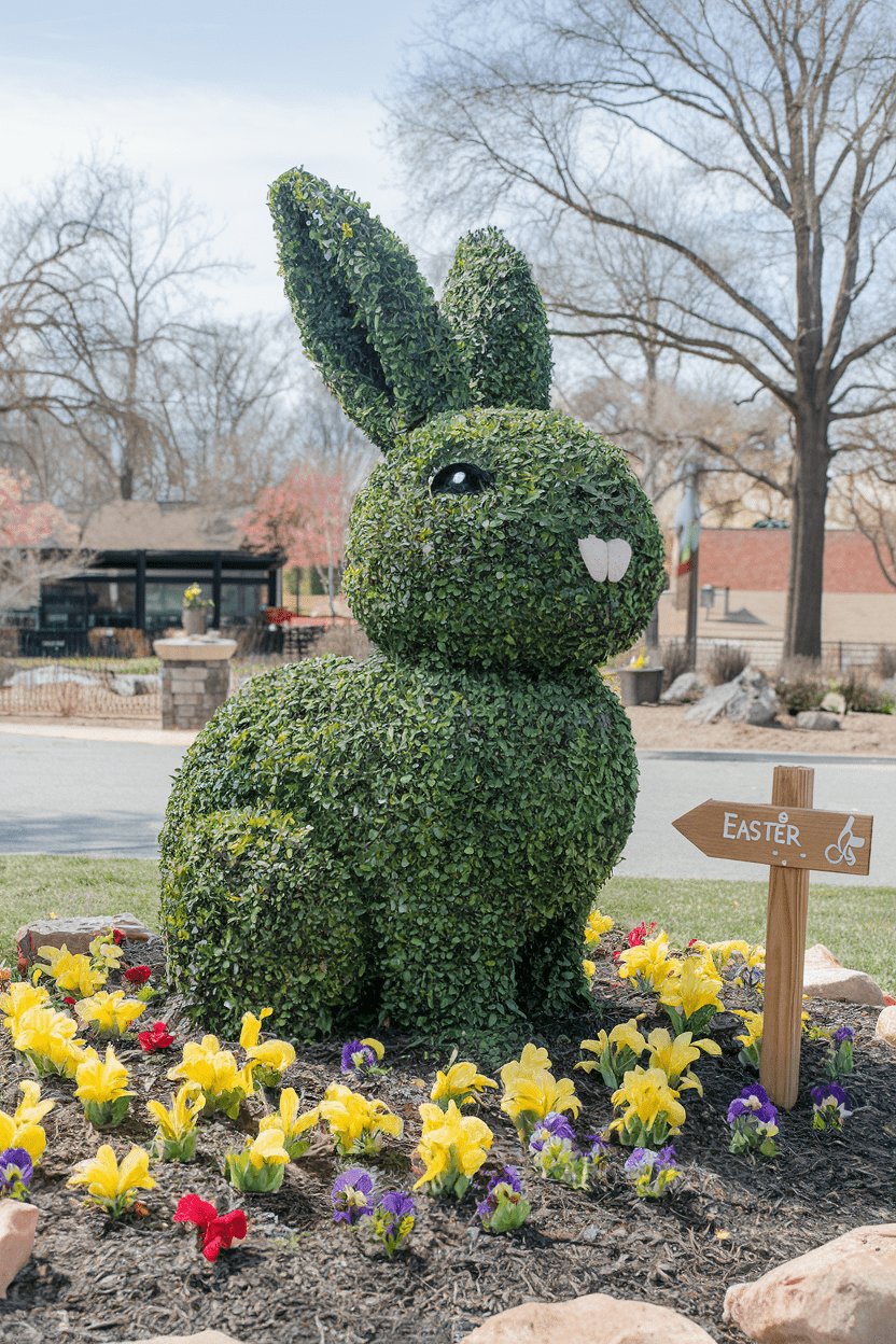 Shape your hedges into a charming bunny silhouette and surround it with a colorful flower bed. Place a wooden sign nearby pointing toward an egg hunt area to create an interactive experience for guests. If you don t have hedges, use a garden trellis with climbing vines to form a bunny shape.