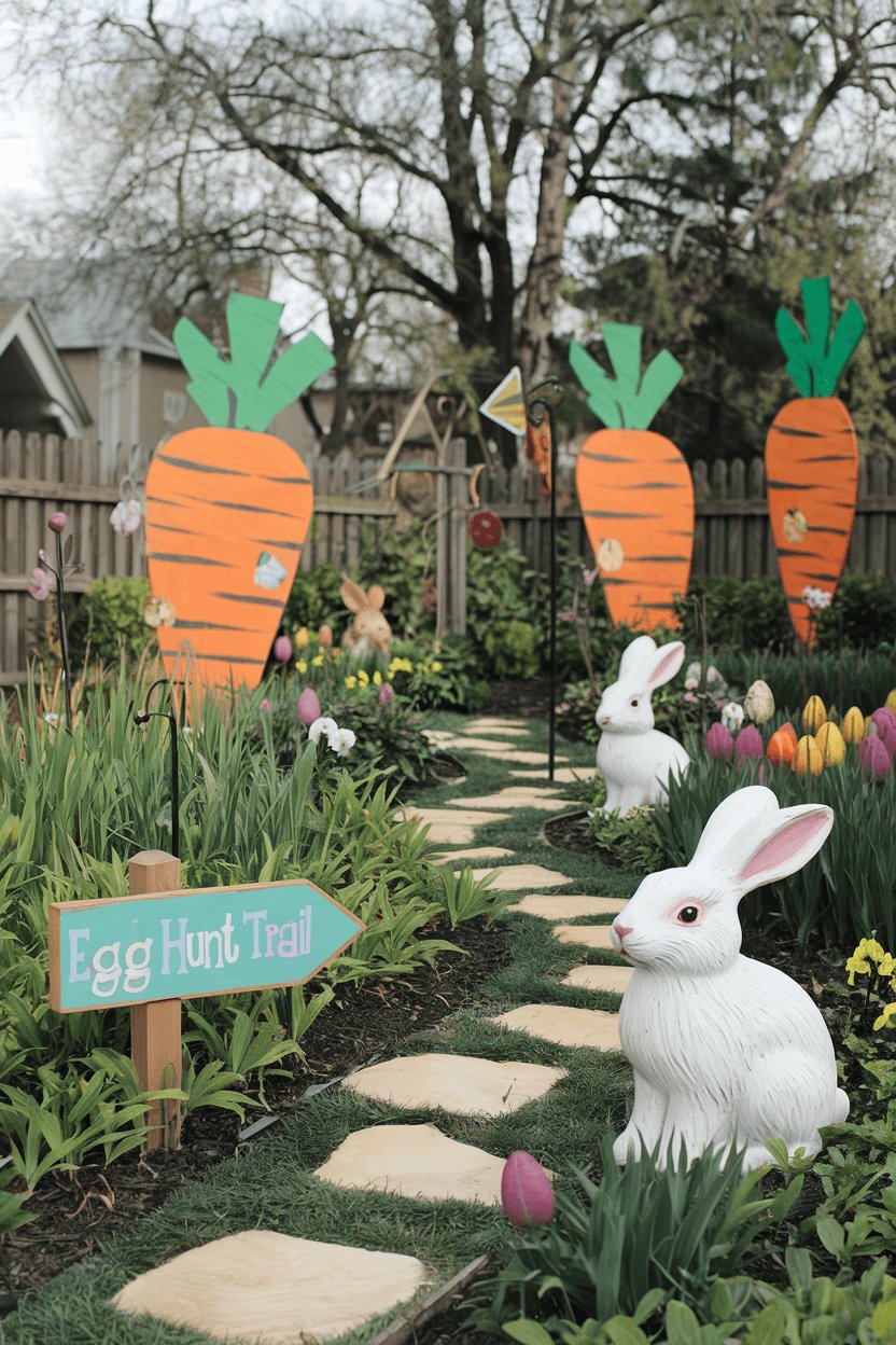 Decorate your garden with oversized carrot decorations, adorable bunny statues, and a hand-painted sign pointing toward an egg hunt trail. Use burlap-wrapped planters to give the setup a rustic charm. Cluster different sizes of carrot props together for a balanced look.