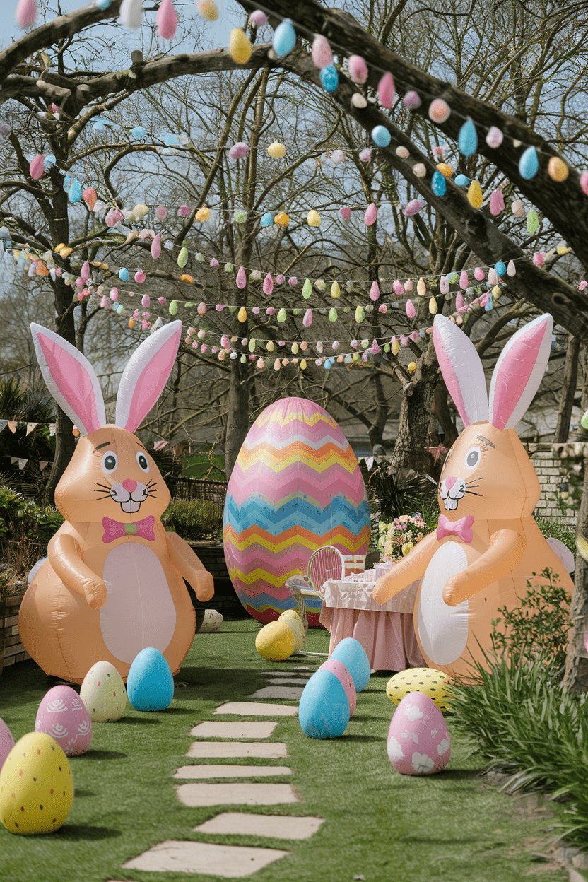 Make your Easter garden even more exciting with oversized inflatable bunnies, colorful egg garlands draped across trees, and a fun photo booth area. Provide playful props like bunny ears and pastel hats to encourage guests to snap festive pictures.