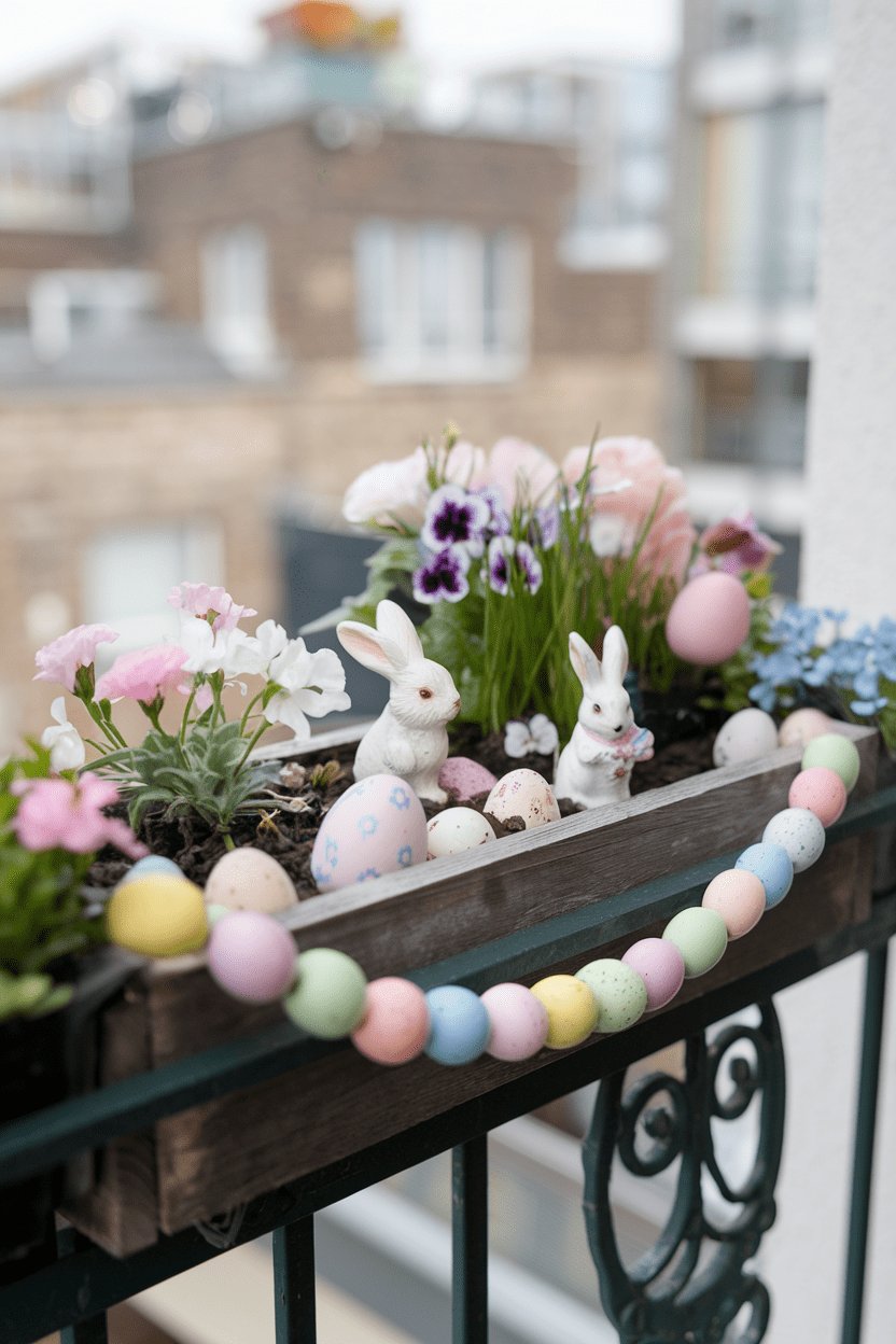 Even small spaces can be festive! Create a tiny Easter garden on a balcony with a wooden planter filled with flowers, mini bunny figurines, and a pastel egg garland. Use tiered plant stands to maximize vertical space.