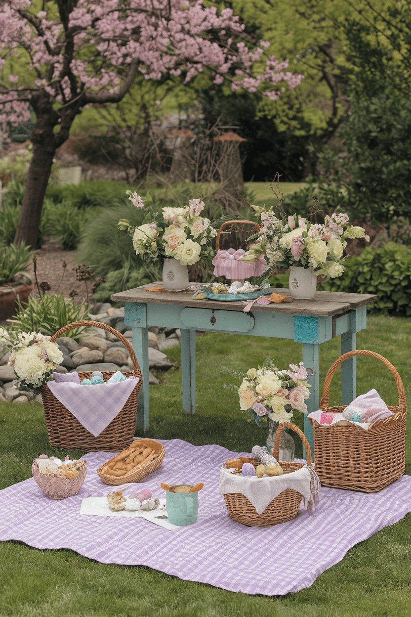 Set up a picturesque Easter picnic with a gingham blanket, wicker baskets filled with treats, and fresh floral arrangements on a rustic wooden table. Add decorative bunny pillows and pastel tableware for a charming touch. Choose a shaded spot for comfort and arrange soft cushions for a cozy feel.