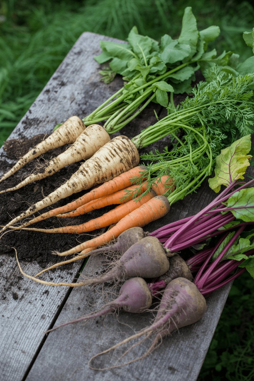 Freshly dug parsnips, carrots, and beets laid out on a rustic table look as good as they taste. These root crops love cool weather and sweeter flavors develop after a light frost. Loosen the soil before planting to help roots grow straight and strong.