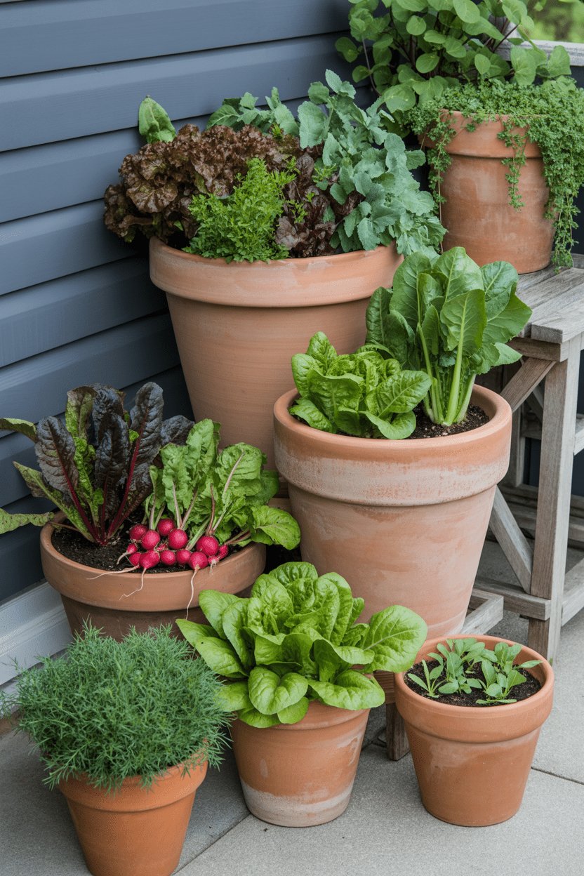 Terracotta pots filled with lettuce, chard, and radishes are perfect for small spaces. Pots warm up faster than the ground, giving you a head start on cool-weather crops. Make sure they get consistent watering container soil dries out faster than garden beds.