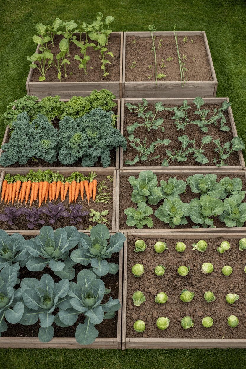 Divide your garden into square-foot plots and fill them with kale, carrots, and Brussels sprouts. This layout makes it simple to organize and rotate crops. Use a string grid to keep everything tidy and maximize every inch of space.