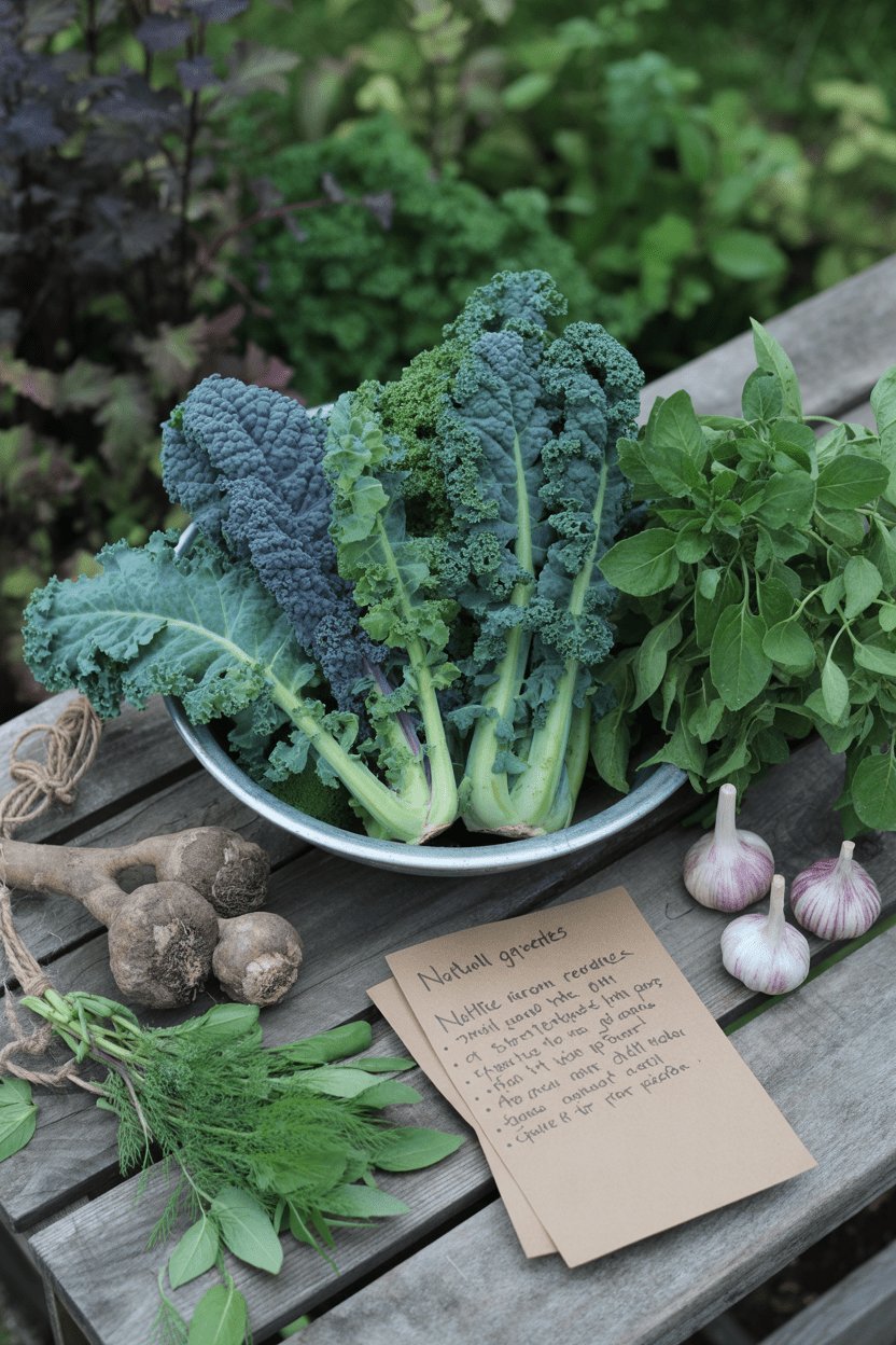 Kale, garlic, and herbs grown together bring both flavor and natural wellness. Plant herbs like thyme or rosemary along the edges to deter pests. Garlic helps improve soil health, making your greens even more robust.