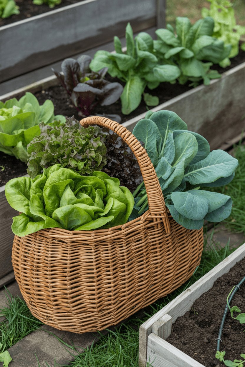 Harvesting lettuce, kale, and spinach into a wicker basket feels timeless. These greens prefer steady moisture, so keep them evenly watered. Harvest often to keep leaves tender and new growth coming.