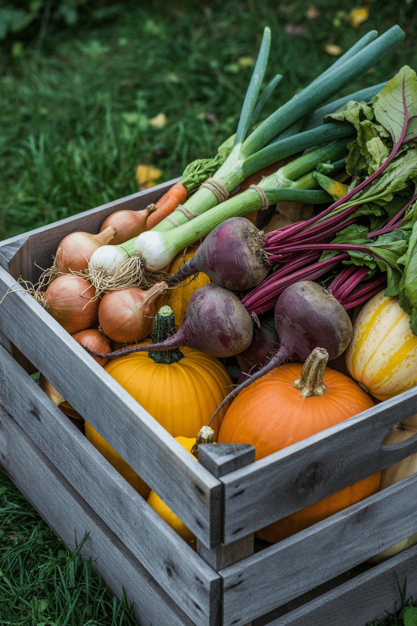 A wooden crate bursting with pumpkins, onions, and beets is as much décor as it is dinner prep. Planting pumpkins alongside onions helps deter pests naturally. Harvesting into crates also makes it easier to carry and store your bounty.