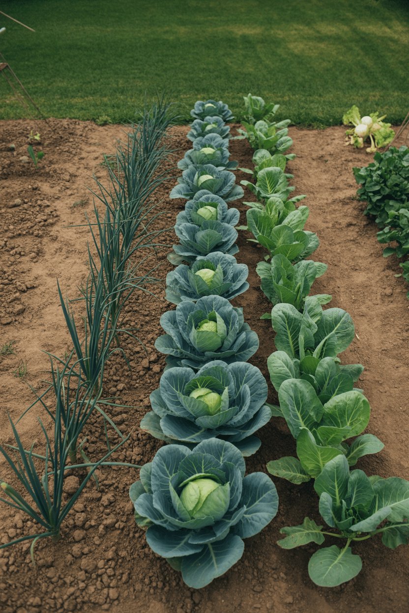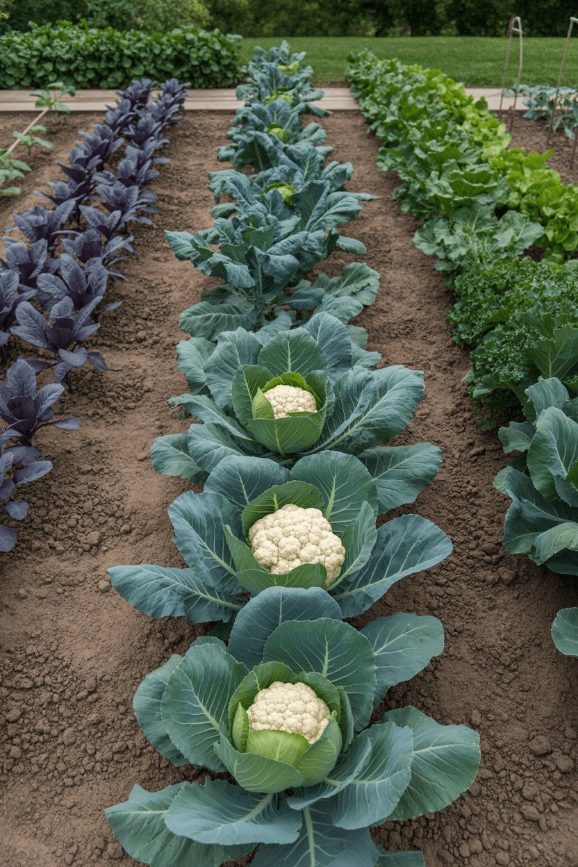 Cauliflower, cabbage, and kale thrive when spaced in long garden rows. This setup lets each plant breathe and reduces disease risk. Mulch between the rows to keep weeds down and conserve moisture as cooler days roll in.