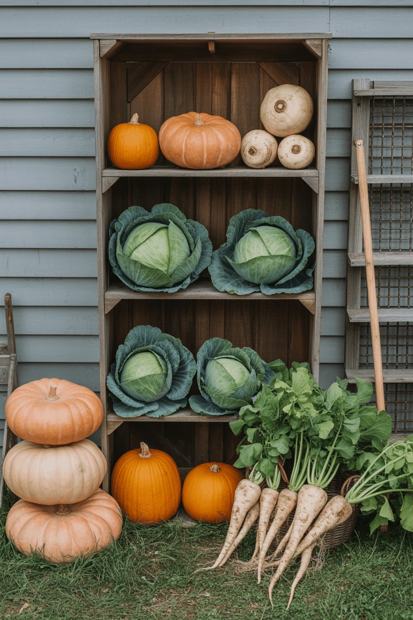 Pumpkins, cabbages, and parsnips stored by your shed keep fall flavors close at hand. Pumpkins cure best in a warm, dry spot before moving them to storage. Keep roots like parsnips in a cool, dark bin for long shelf life.