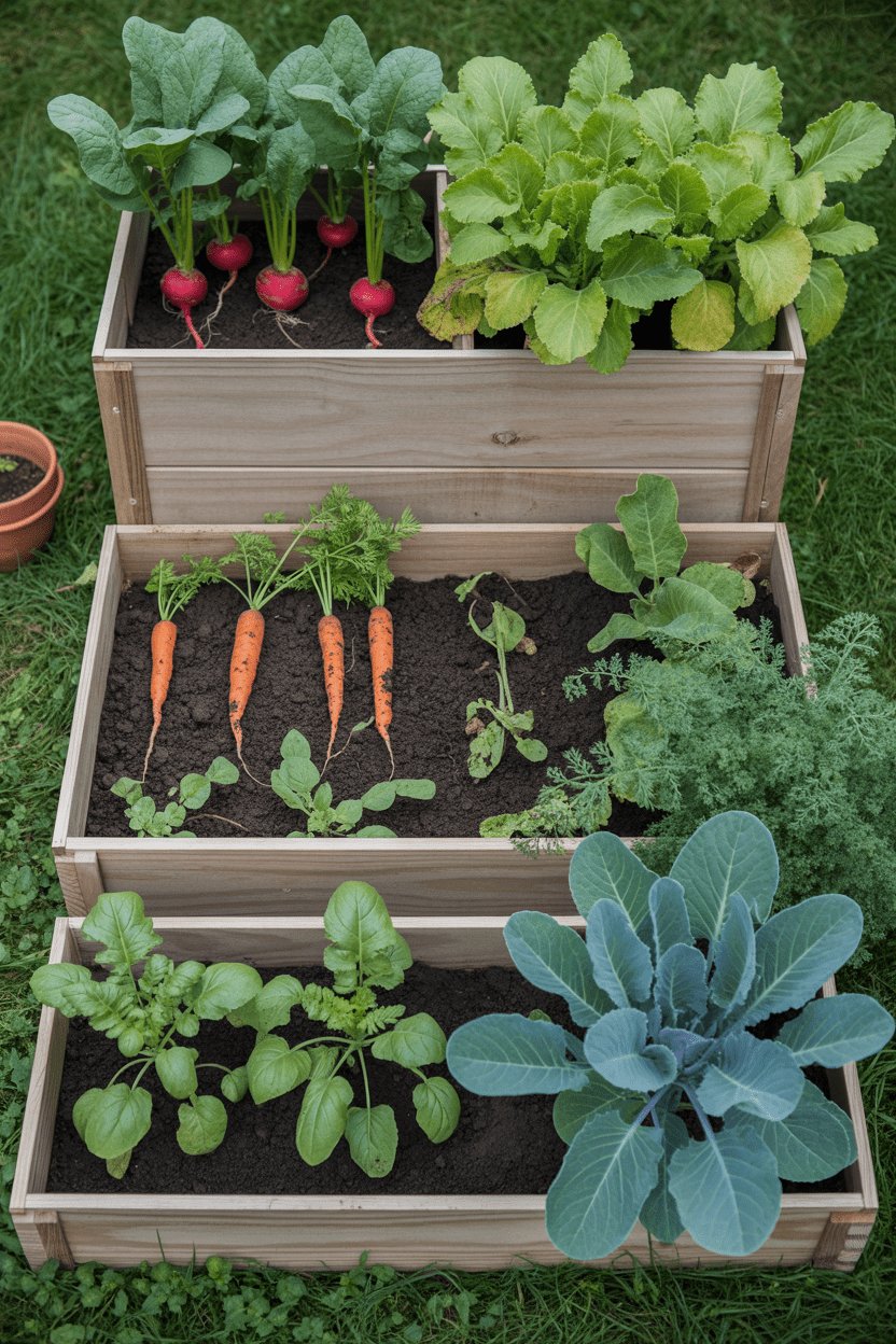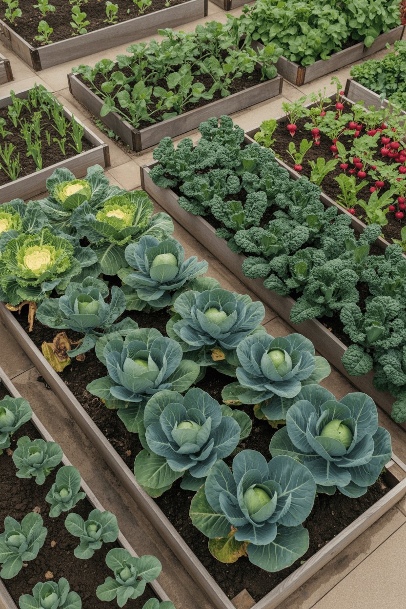 Cabbage, kale, and radishes arranged in geometric patterns create a striking fall layout. Not only does it look neat, but it also makes weeding and watering efficient. Mix fast growers like radishes with slower crops for continuous picking.