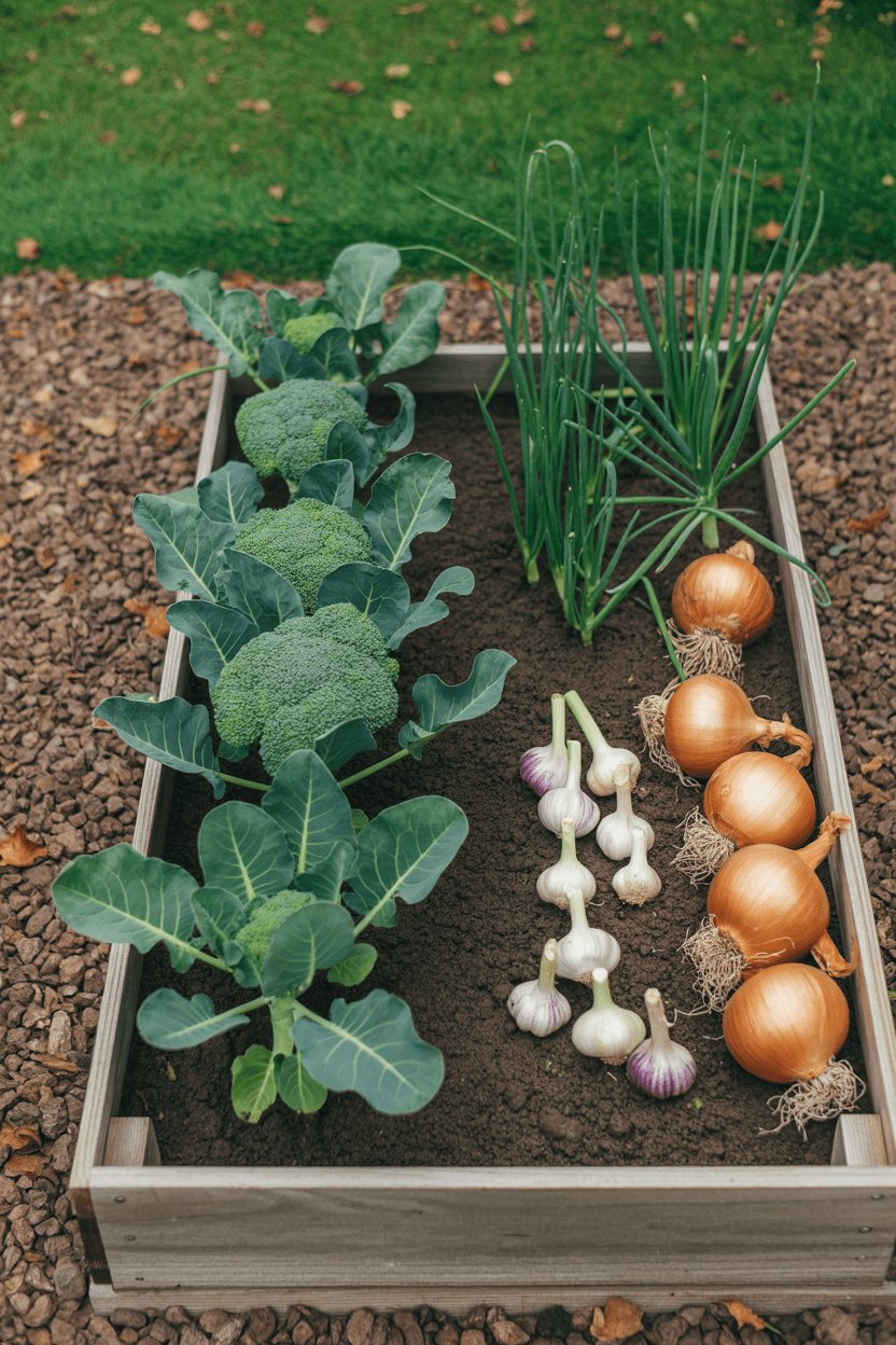 Broccoli paired with onions and garlic is a natural pest control team. The strong scent of onions and garlic deters bugs that love broccoli. Plant in staggered rows to give each crop the room it needs.