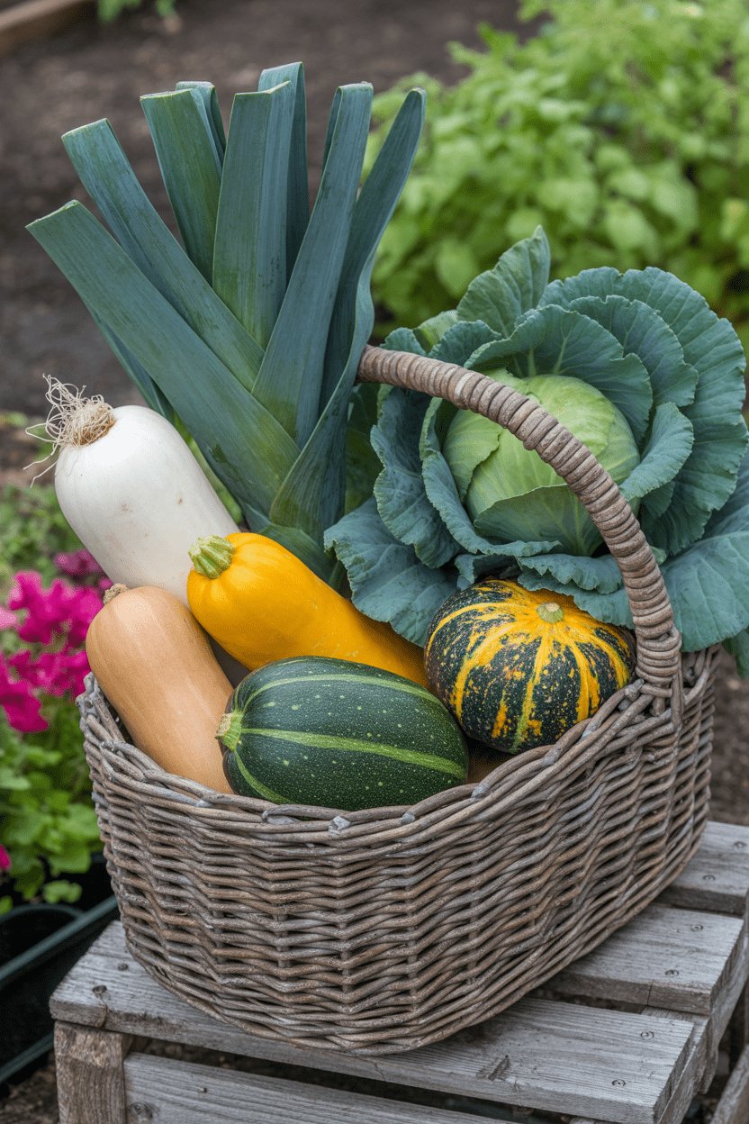 A basket full of squash, kale, and leeks makes for a vibrant fall harvest. Squash needs room, but kale and leeks tuck neatly nearby. Staggering planting times ensures your basket stays colorful for weeks.