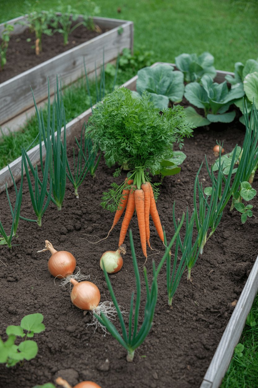 Carrots and onions share space nicely, each protecting the other from pests. The key is spacing don t crowd them or growth will suffer. Sow carrots first, then tuck onion sets between the rows.