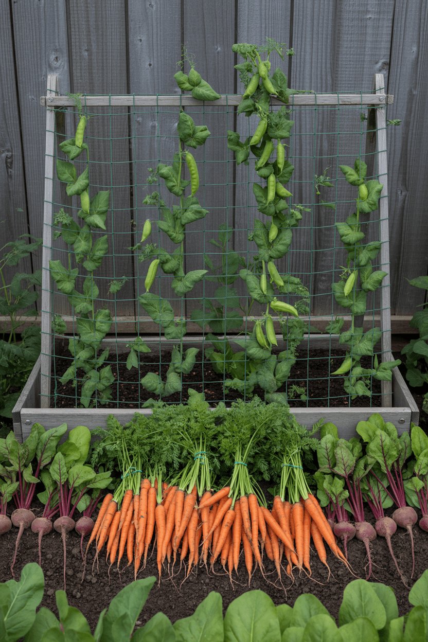 Let peas and beans climb a fence while carrots and beets spread below. This vertical-horizontal combo uses space smartly. Add a trellis or netting to keep vines supported and easy to pick.