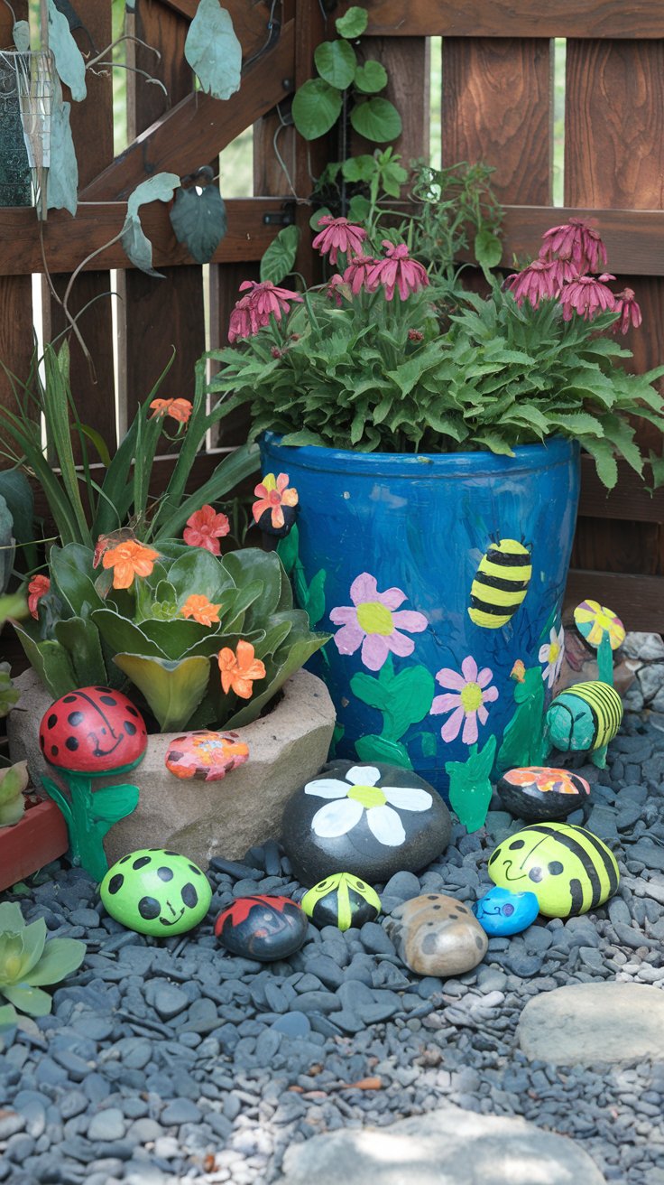 Add personality to your garden with hand-painted rocks shaped like ladybugs, bees, and flowers. Arrange them around potted plants for a fun and colorful touch. Use waterproof paints to keep the designs vivid over time.