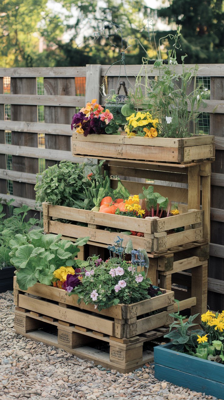 Build a multi-tiered planter from recycled pallets and fill each level with a mix of vegetables, flowers, and herbs. This vertical design saves space while offering a beautiful, layered look.