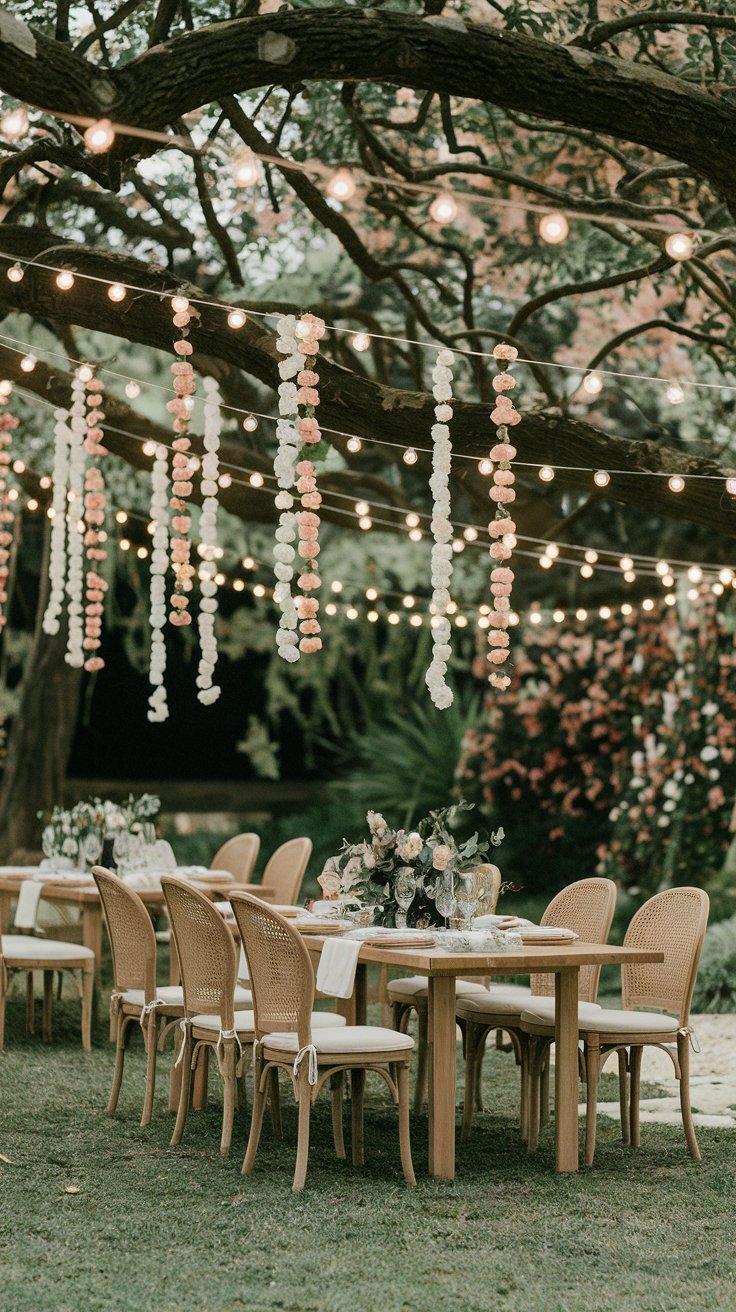 Wrap garlands of fresh flowers and string lights around tree branches for a festive outdoor party. Use durable twine to secure the flowers, and opt for LED lights to keep the ambiance bright and safe.