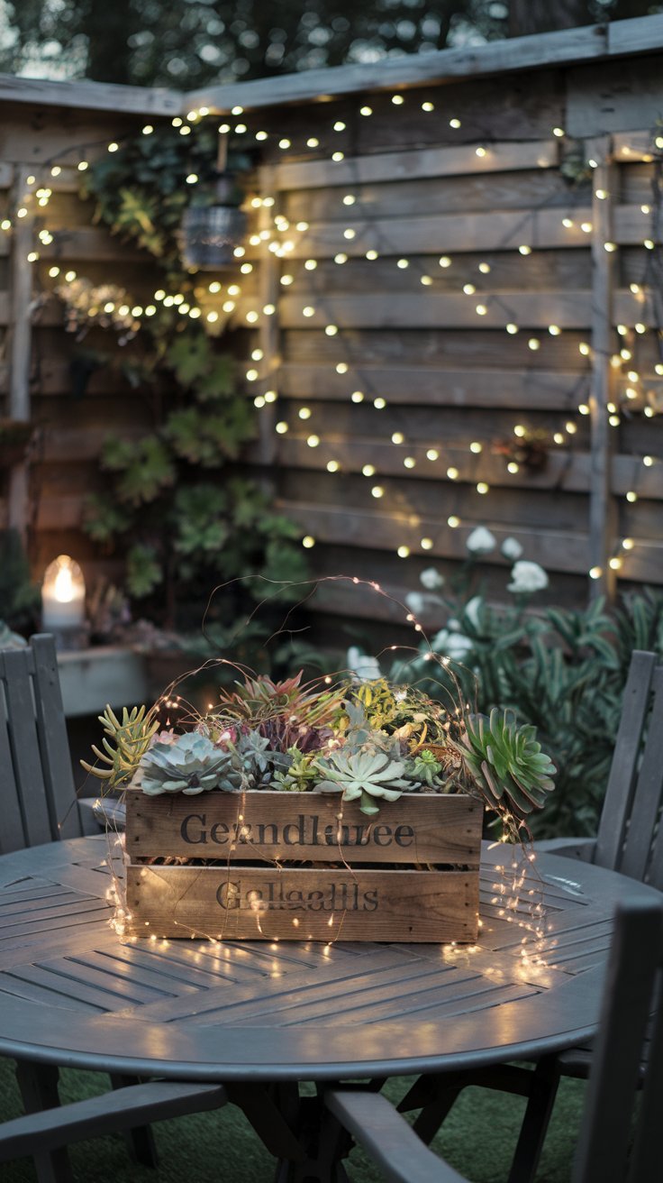 Transform a wooden crate into a table centerpiece by lining it with succulents and wrapping fairy lights around the edges. Choose hardy, drought-resistant plants for a low-maintenance setup. The twinkling lights will create a magical glow for your evening gatherings.