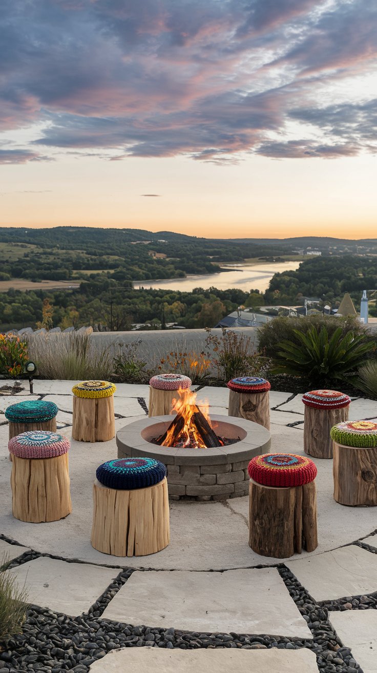 Create a welcoming fire pit area with log stools topped with colorful knitted cushions. Arrange the stools in a circle and add a few outdoor rugs for a cozy, communal feel.