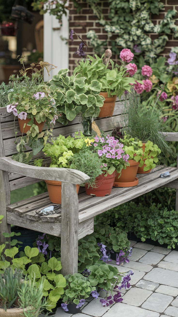 Turn an old wooden bench into a stunning plant display by placing pots of herbs and flowers on its surface. Let plants spill over the edges for a lush, overflowing effect. Sand and paint the bench to protect it from the elements.