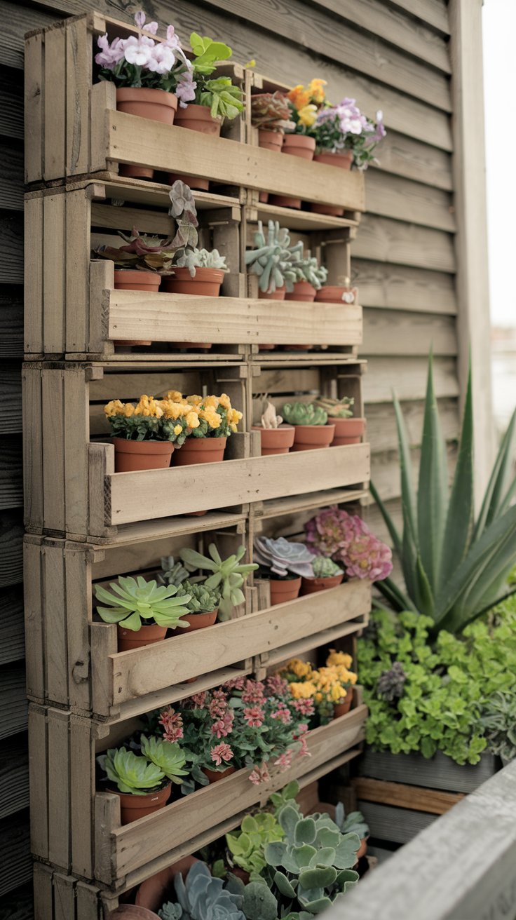 Stack wooden crates to create a compact vertical garden. Fill each crate with small pots of succulents and flowering plants. Secure the crates together for stability and place them in a sunny spot to thrive.