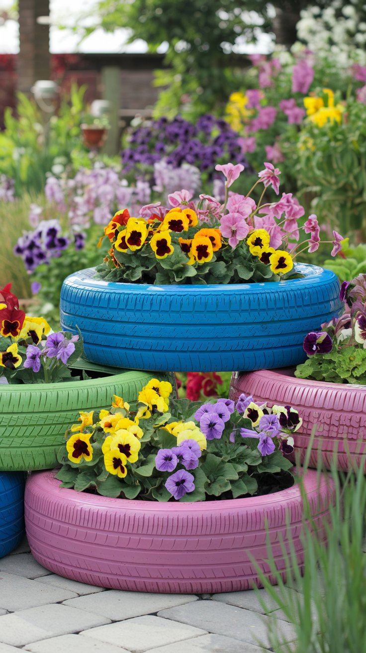 Give old tires a new life by painting them in bright colors and stacking them into a pyramid. Fill each level with soil and plant a mix of colorful flowers. This DIY project is perfect for adding height and a splash of fun to your garden.