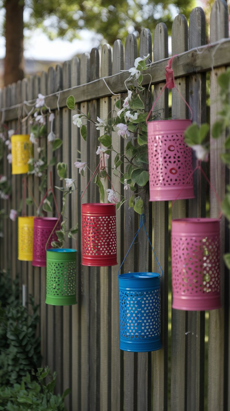 Paint tin cans in bold hues and cut intricate patterns into their sides. Add tea lights or LED candles inside and hang them on a plain fence to create a stunning, glowing backdrop.