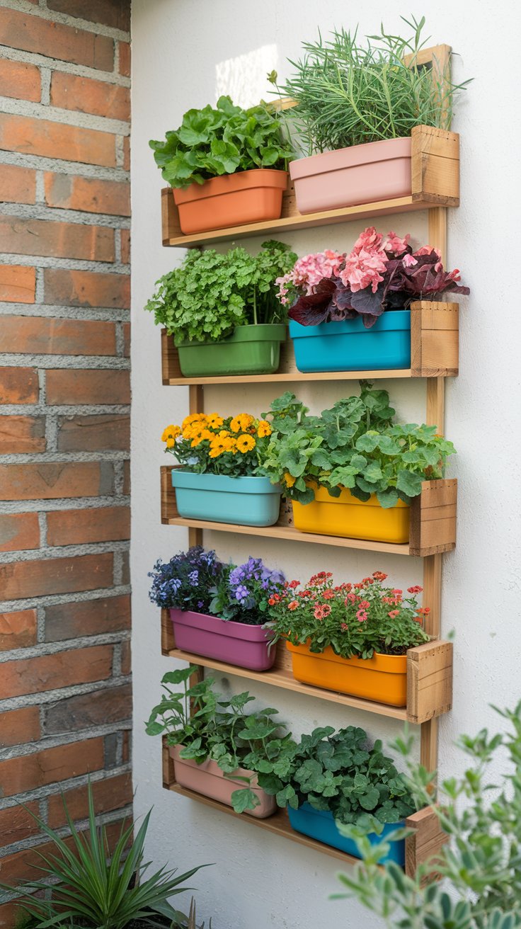Craft wooden frames to hold an array of colorful pots filled with herbs and flowers. Mount them vertically to maximize space and create a lively, green wall. Arrange the pots in a rainbow pattern for a cheerful, eye-catching design.