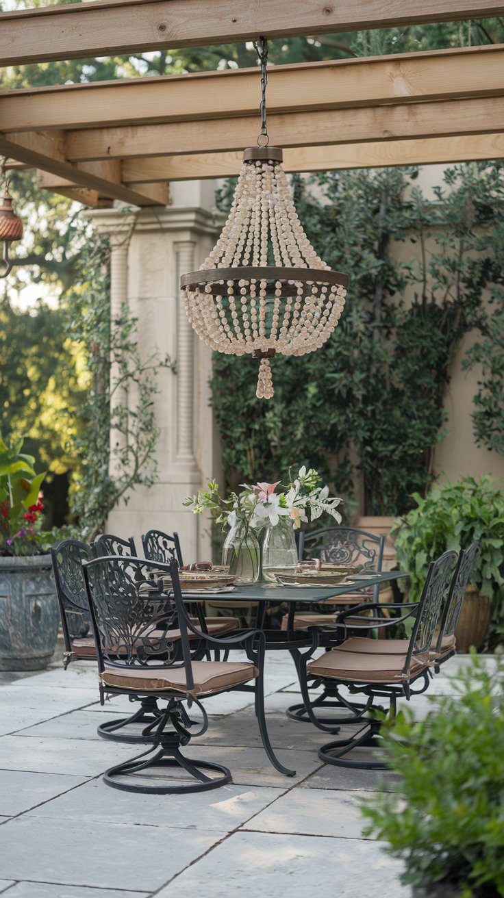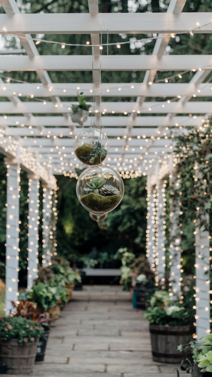 Wrap fairy lights around a pergola and hang glass orbs filled with succulents and moss. This enchanting setup adds soft lighting to your outdoor seating area. Mix in different orb sizes for visual interest and a truly magical ambiance.