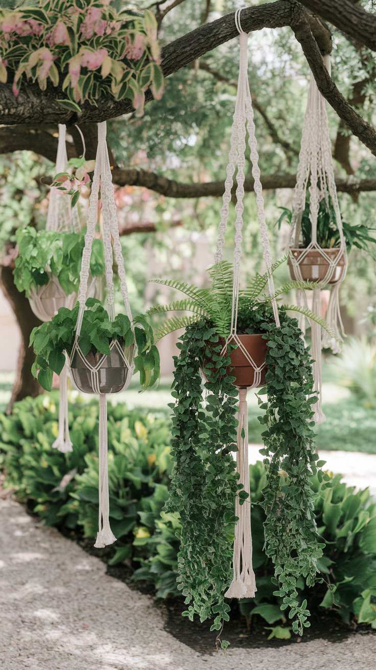 Suspend macrame planters from tree branches or pergolas, filling them with cascading ivy or ferns. Choose natural-colored rope for a boho vibe or opt for bright threads to match your garden s theme.