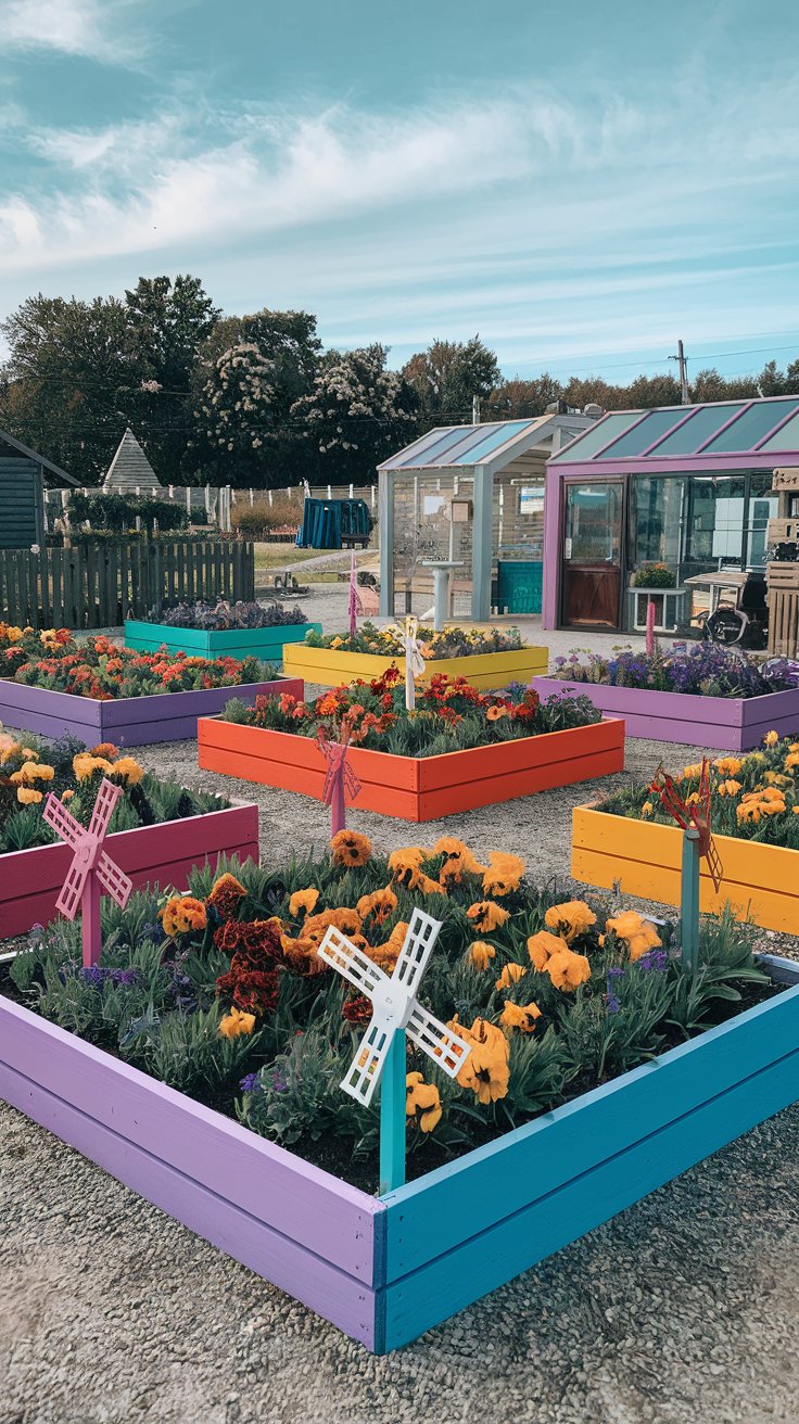 Frame your flower beds with wooden planks painted in rainbow colors. Add decorative windmills at intervals for a whimsical touch. This project brightens up the space and adds movement with every breeze.