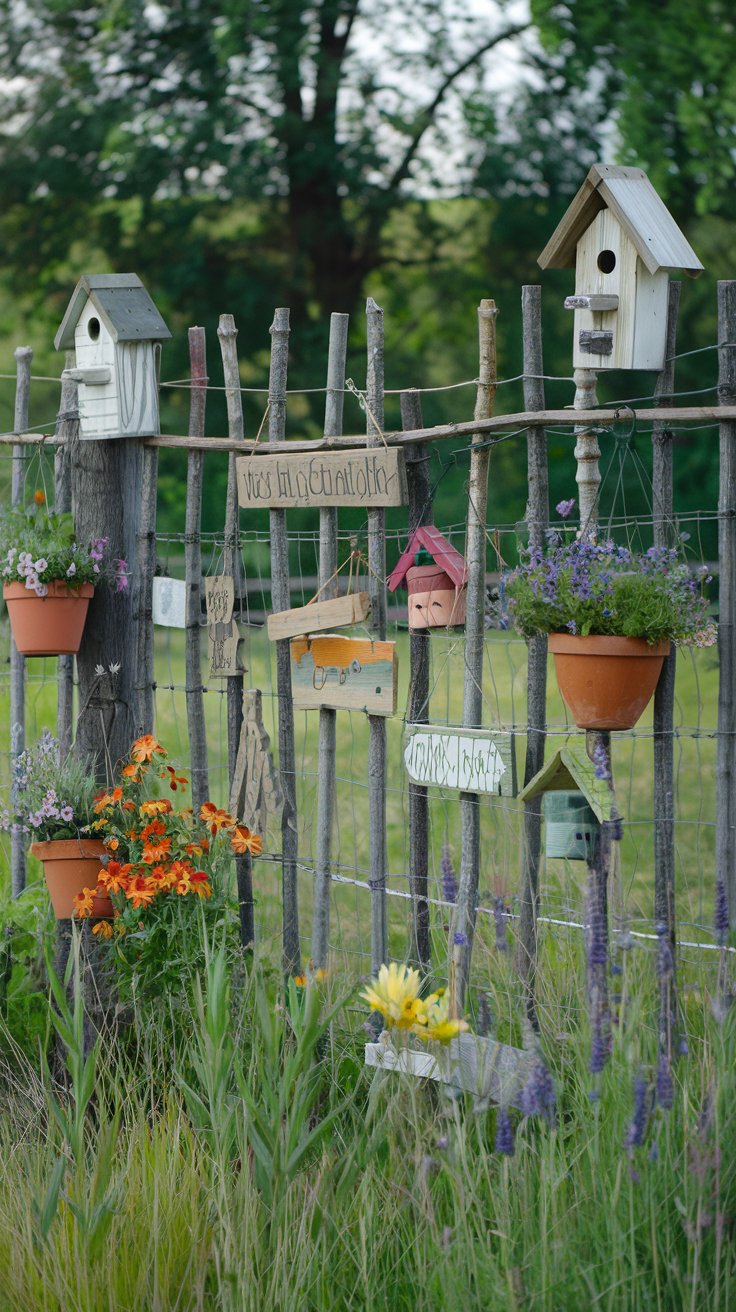 Decorate your garden fence with handmade wooden signs, birdhouses, and hanging terracotta pots filled with wildflowers. Use weatherproof paints to ensure your creations withstand the elements. Arrange the items in clusters for a visually appealing, rustic vibe.