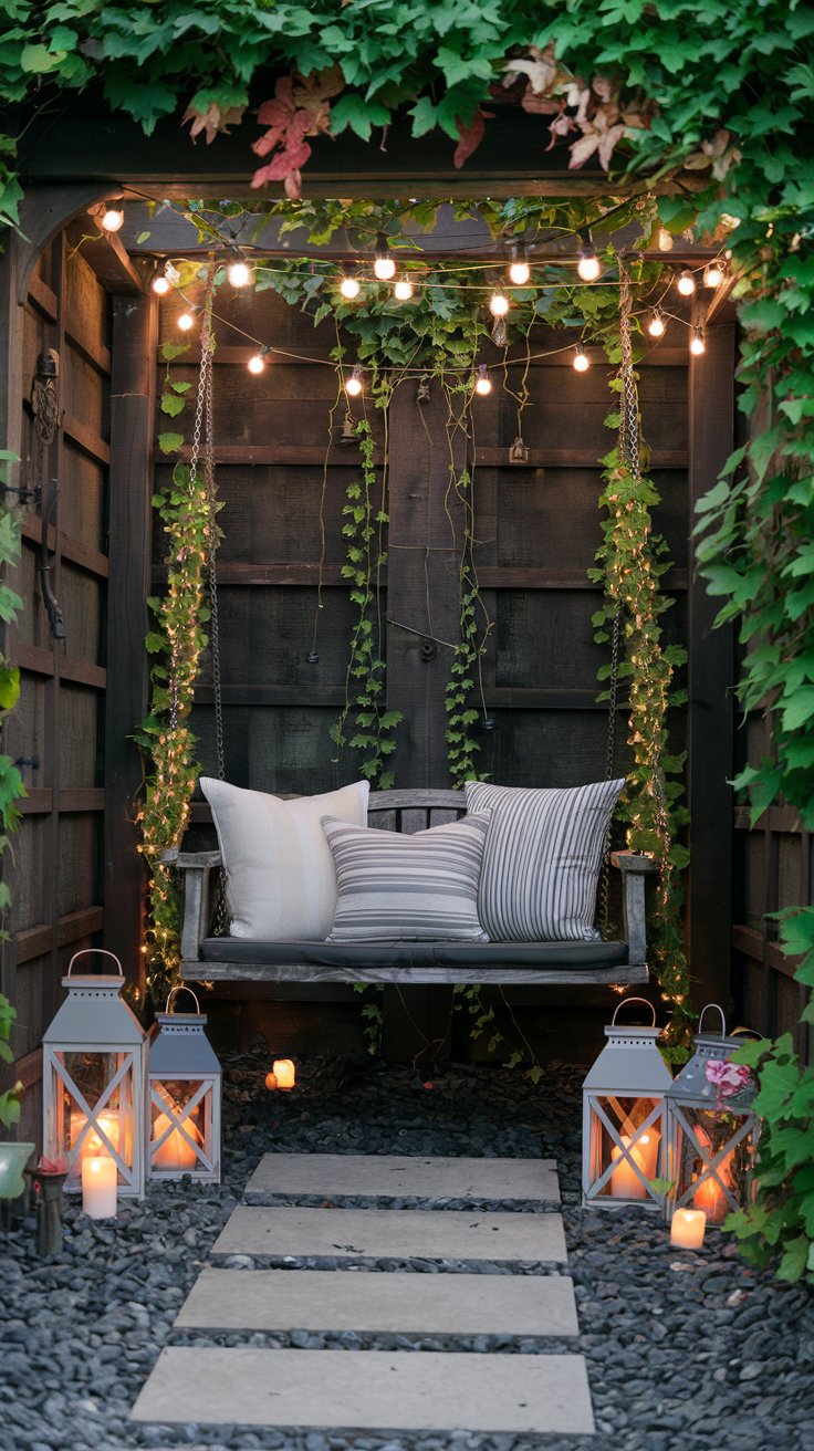Wrap an old swing in vines and string lights, then surround it with candles in DIY lanterns. This dreamy setup is perfect for relaxing evenings in your garden. Add cushions for extra comfort.